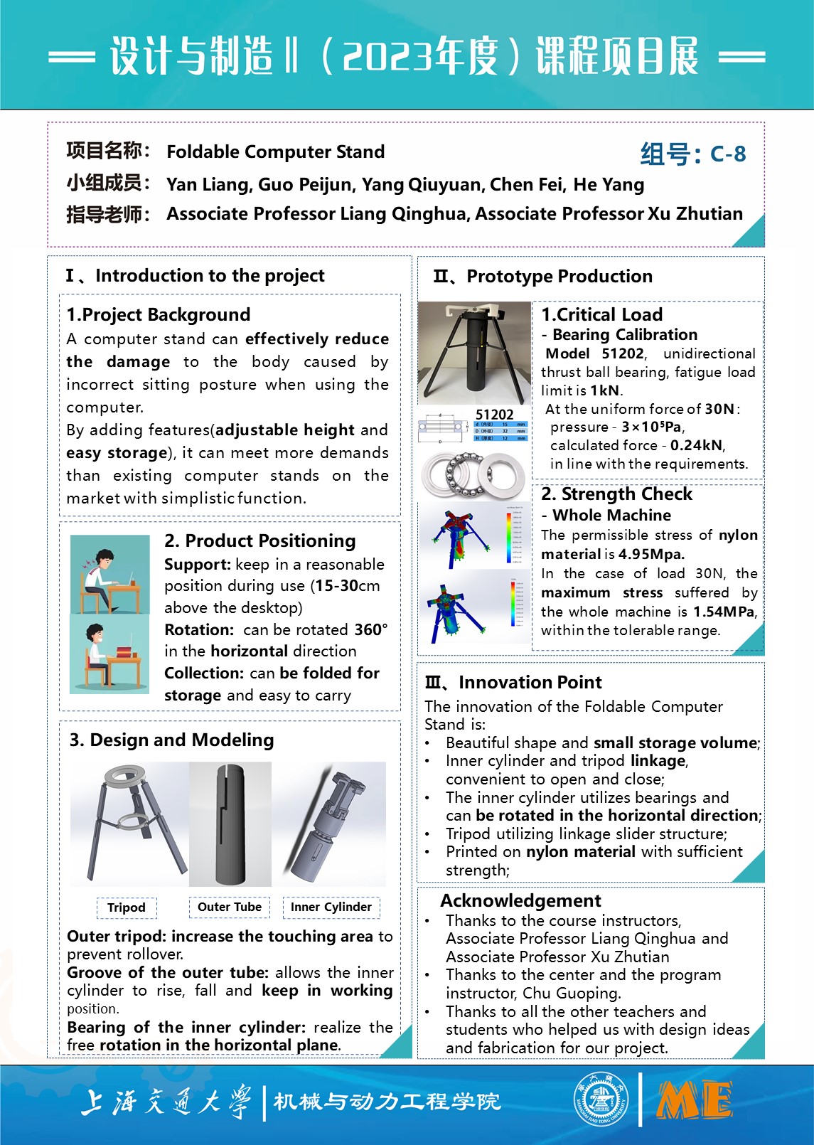 为了实现既定的主要功能目标:灵活调节高度角度、便携可收纳,我们进行了材料选用分析、结构设计、力公司核分析等工作,通过对比不同模型3D建模下受力变形程度,综合考虑用户的使用需求,通过3D打印与金属车床加工等加工方式制造出了最终的产品。