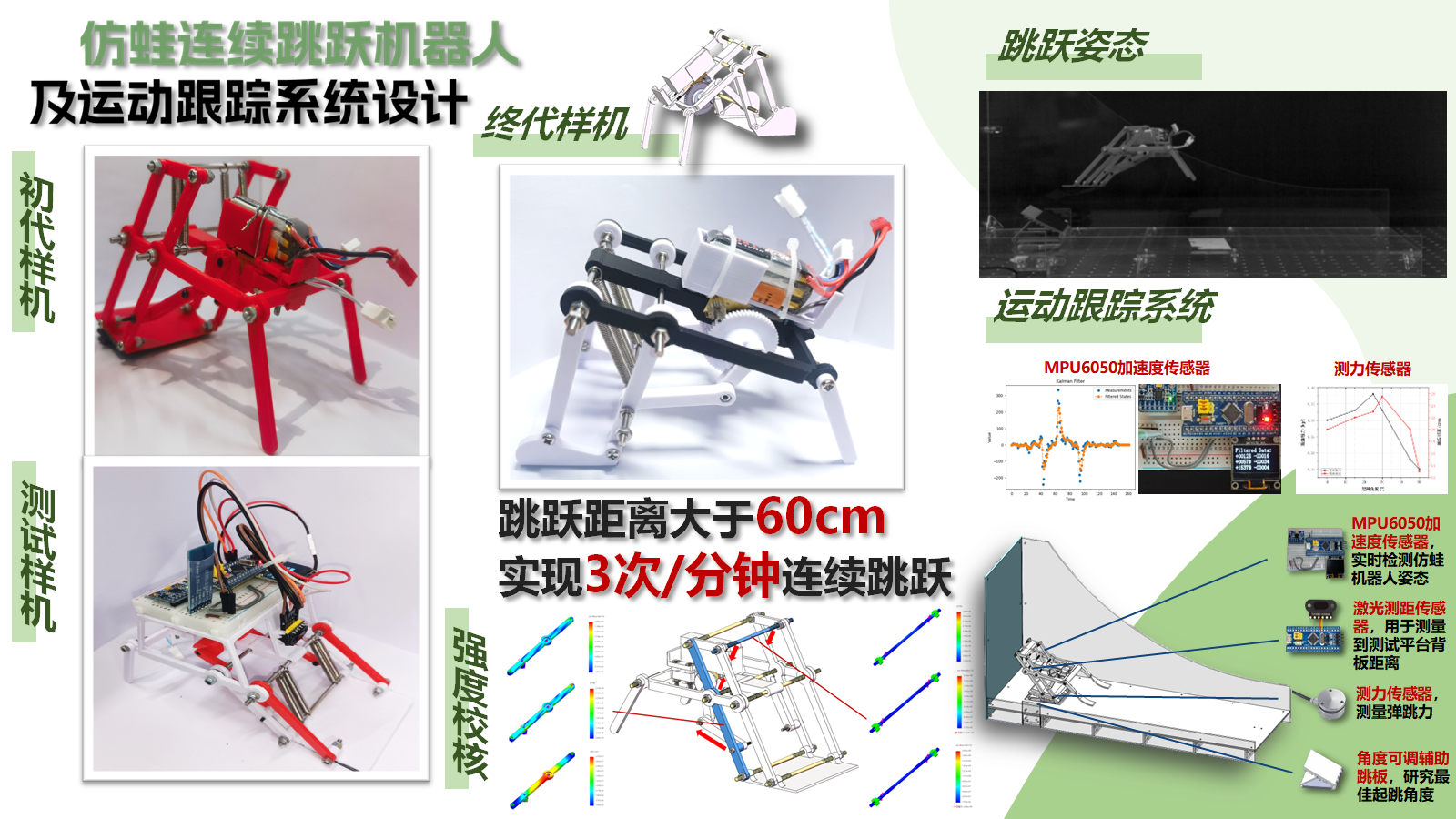 (1)高度仿蛙的机械结构与运动方式: 成功设计出与青蛙高度相似的跳跃机器人的轻量且稳定的机械结构,模仿青蛙蓄力、跳跃、姿态调整的运动方式;