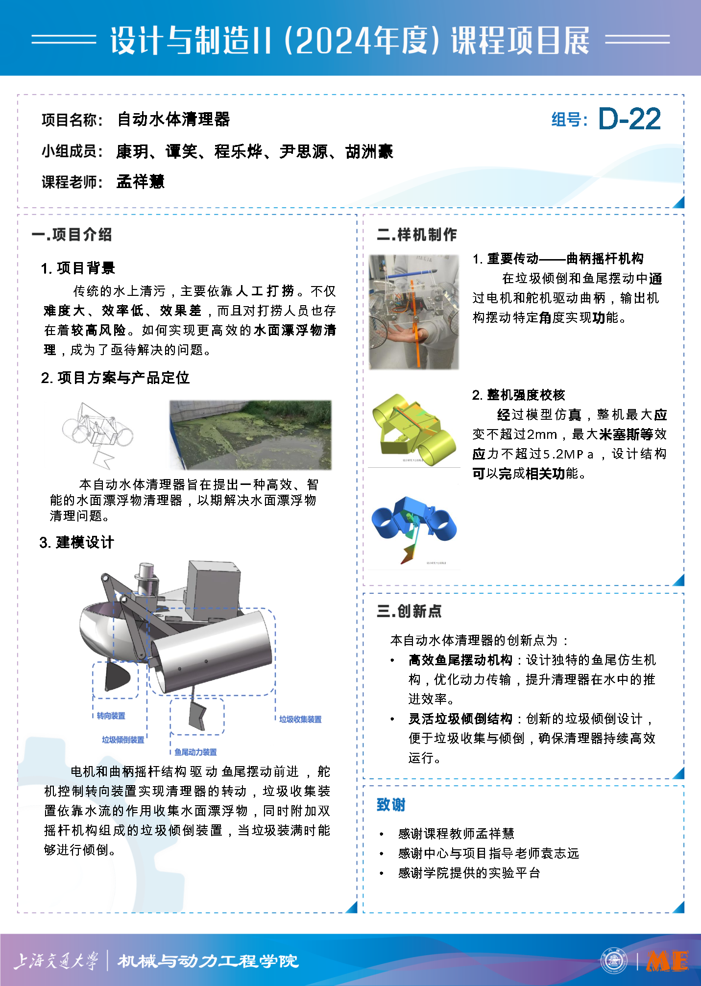 本项目成功设计并制造了一款自动水面漂浮物清理器。在机械设计方面,采用鱼尾摆动机构实现前进和转向,通过垃圾收集机构收集漂浮物,利用垃圾倾倒装置集中清理垃圾。船体采用亚克力切割和3D打印的方式制作,结构紧凑、重量轻、强度高。在电子控制方面,通过电机和舵机带动装置运动,实现平稳游动和灵活转向。