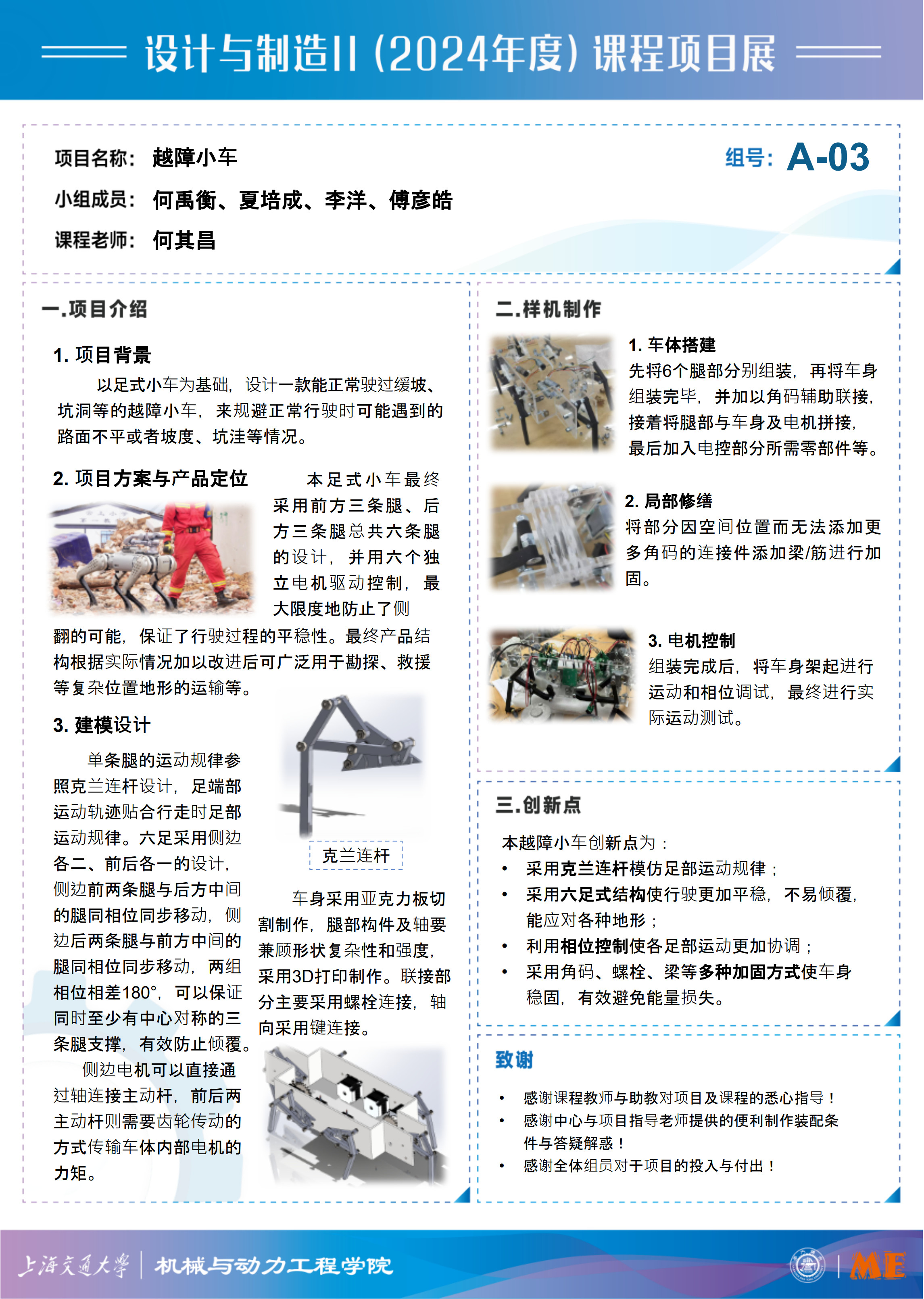 在日常生活或者项目设计中难免遇到交通工具经过路面不平或者坡度、坑洼等情况,因此我们组以小车为基础,想要设计一款能正常驶过缓坡、坑洞等的越障小车,来规避正常行驶时可能遇到的路况危险。结合挑战赛要求,我们设计了一款以克兰连杆为主要结构的越障小车。