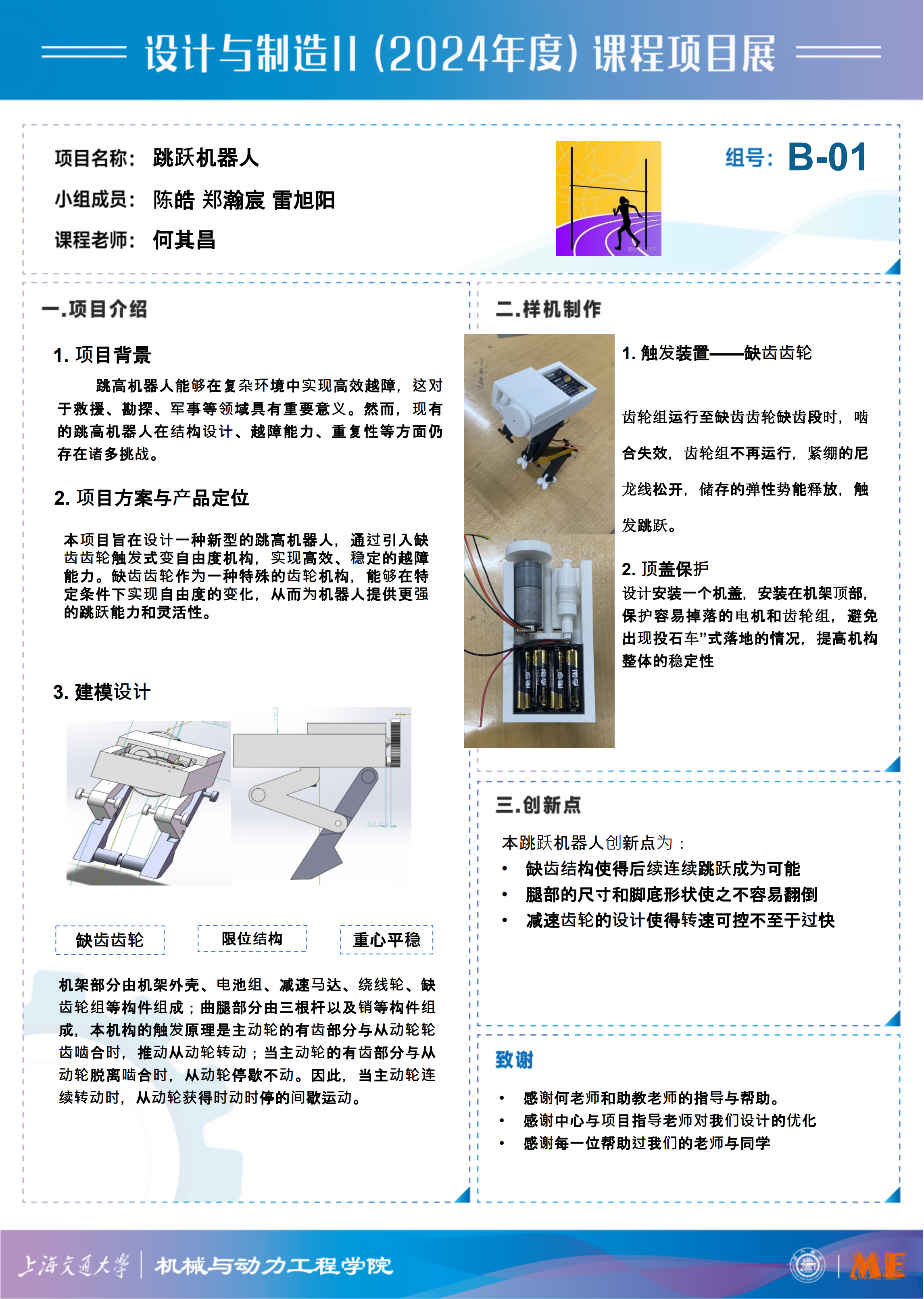 在小组成员的共同努力下,我们完成了整个跳跃机器人的制作与装配过程。该机器人在电路断开时能在地面上保持平稳,在通电时能通过机构运动达到预期的弹跳高度。尽管如此,整个机器人也还有优化的空间。利用缺齿齿轮改变自由度的特性来匹配电机转速,实现连续跳跃,是我们在后续过程中可以深入研究的问题。