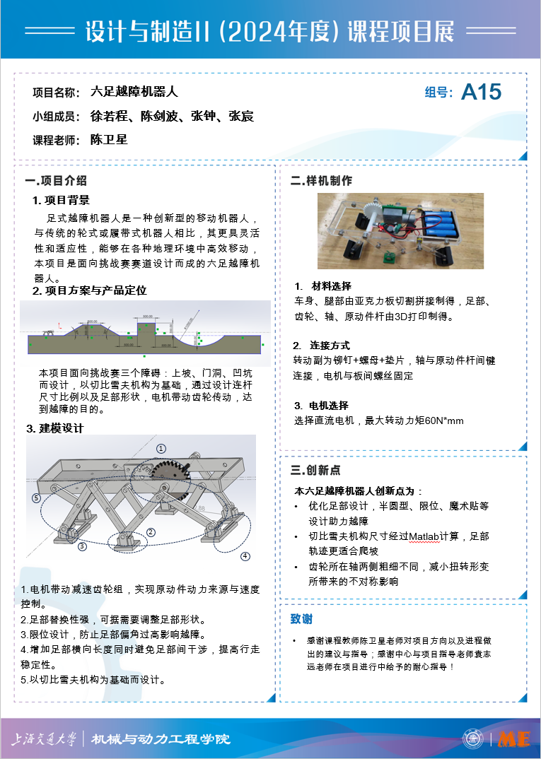 本项目面向挑战赛三个障碍:上坡、门洞、凹坑而设计,以切比雪夫机构为基础,通过设计连杆尺寸比例以及足部形状,电机带动齿轮传动,达到越障的目的。