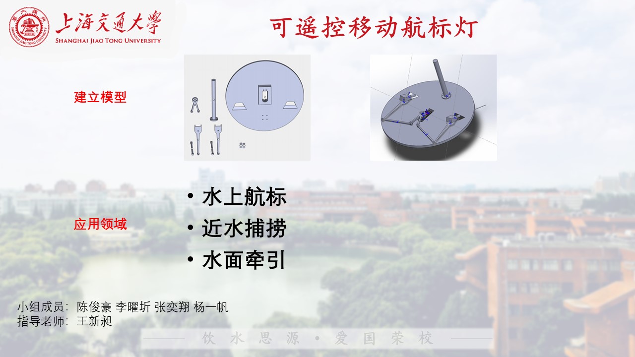 航标灯是安装在某些航标上的一类交通灯,在夜间发光对夜行的船舶进行指引。目前大部分浮标航标灯都利用锚或重物固定漂浮在某处,这为安装和回收带来了一定麻烦。于是我们设计可遥控移动航标灯解决如上问题。