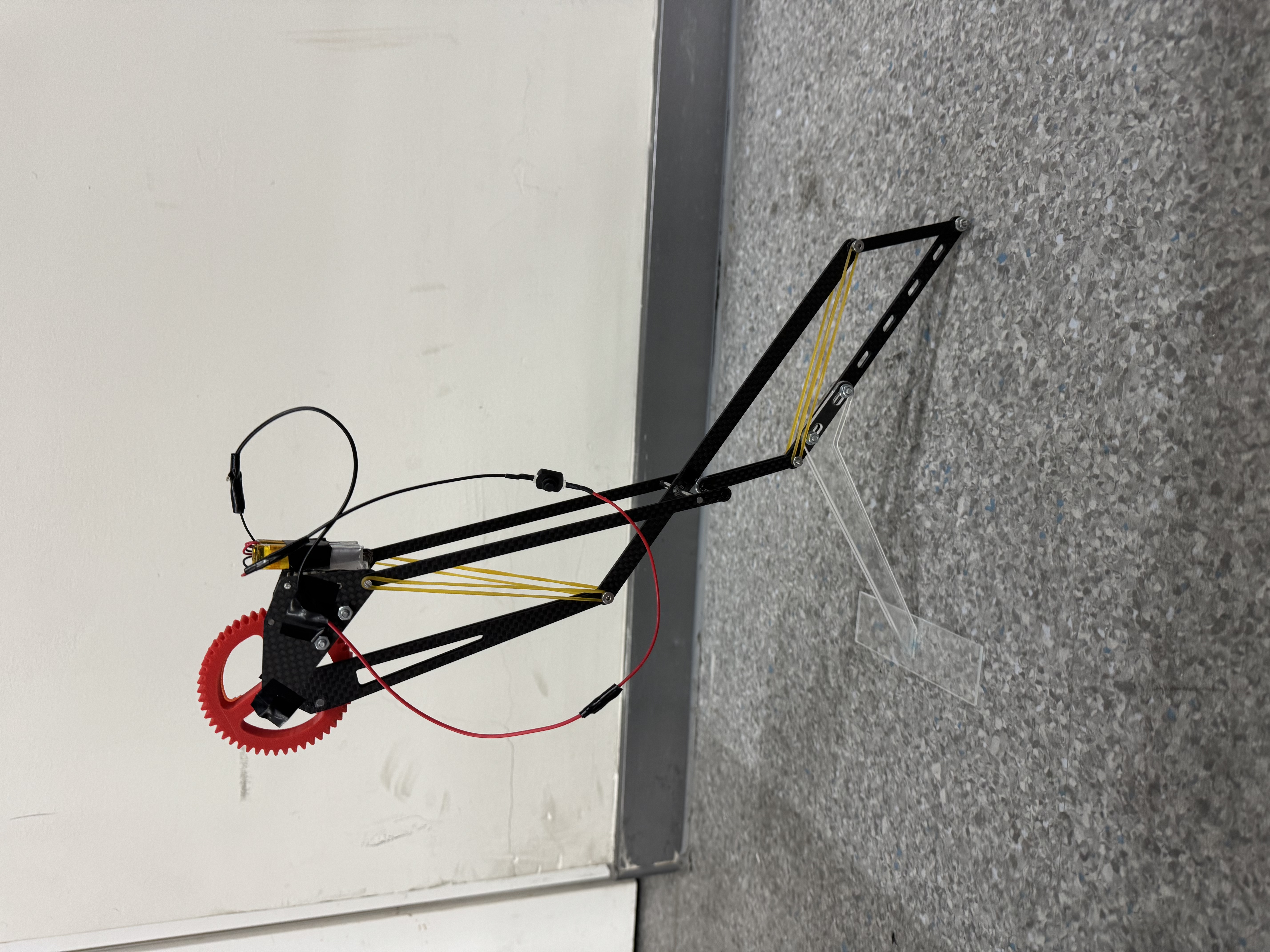 机器人拉伸极限尺寸10.0cm×19.1cm×29.8cm,平均跳跃高度约20cm(4个橡皮筋)大于15cm,重约0.15kg小于0.3kg,可依靠支撑脚调整重心实现向前跳跃,开启开关后能自动完成跳跃过程,各项均满足工程规范要求。