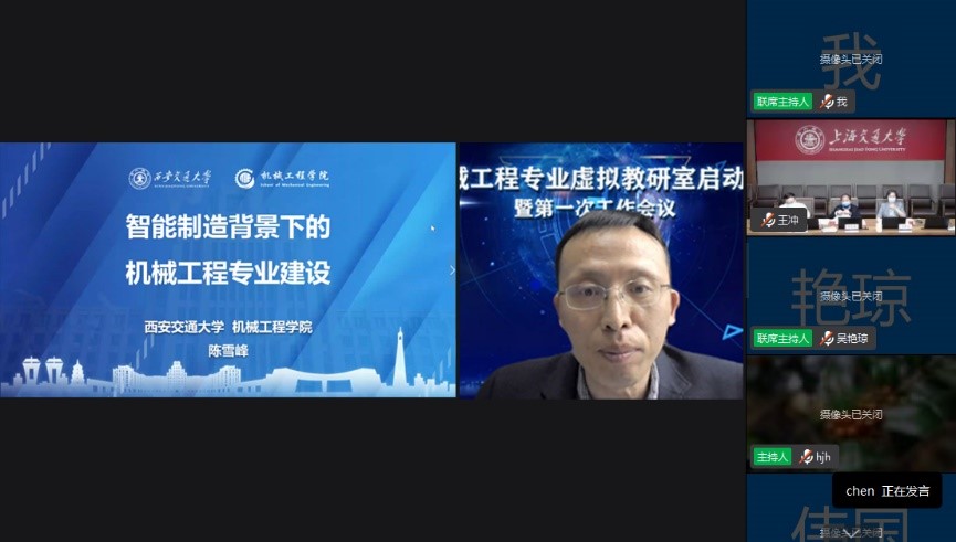 西安交通大学机械工程公司经理陈雪峰教授以西安交通大学智能制造工程专业为例作“智能制造背景下的机械工程专业建设”主题报告,重点介绍了相关专业需求背景、建设情况、培养方案及专业资源基础情况,为持续开展培养方案与课程体系建设等虚拟教研室相关教研活动树立了典范。