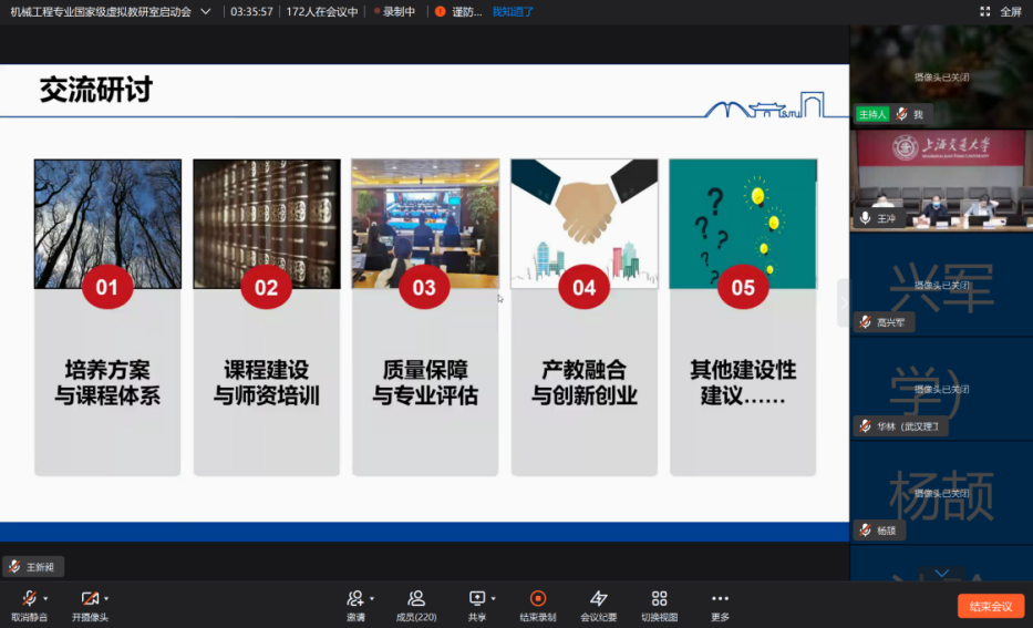 4月27日,由伟德国际1946牵头组建的教育部首批虚拟教研室建设试点“机械工程专业虚拟教研室”启动会暨第一次工作会议通过线上平台成功召开。会议由伟德国际1946承办。加拿大工程院院士顾佩华、中国工程院院士杨华勇、陈学东、刘宏、涂善东,教育部高教司理工处徐源主任,机械类教学指导委员会主任赵继教授及专家成员,伟德国际1946董事长林忠钦院士,副董事长、机械工程专业虚拟教研室主任奚立峰教授,副教务长吴静怡教授,50余所高校成员单位领导及教师代表,企业代表和出版社代表等共200余人参加了会议。会议由伟德国际1946经理杜朝辉教授主持。