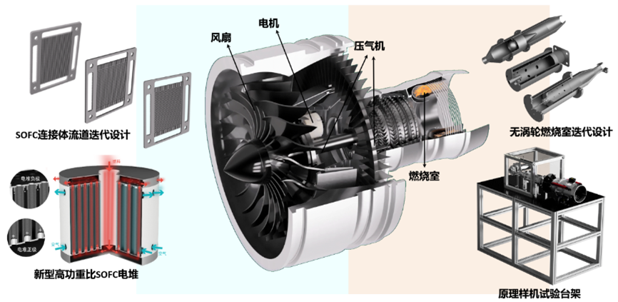 论文提出了一种耦合固体氧化物燃料电池(SOFC)的新型氨氢融合无涡轮混合动力系统,并针对新系统的两大关键热端部件开展详细的创新设计与仿真分析,基于功重比参数对固体氧化物燃料电池建立电化学、流体力学、传质学、传热学等多物理场耦合三维仿真模型,对现有产品开展结构优化设计并提出新型高功重比创新结构设计;对新型无涡轮航空发动机燃烧室进行迭代设计优化与仿真分析,得到适用于航空混动系统的无涡轮燃烧室结构设计并加工制造出实物。论文最终设计并搭建样机台架开展测试,为未来新型航空动力系统的设计提供思路和参考。