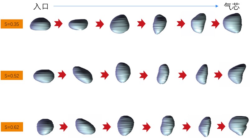 为了获得旋流场中气泡的三维形状,本项目利用虚拟双目立体视觉三维可视化系统和气泡智能跟随升降平台,对静水和旋流场中气泡的运动进行了拍摄,并编写相应算法实现了气泡三维形状的重建。静水中的重建结果验证了实验方法和重建算法的可靠性,从旋流分离器中的重建结果中则首次获得了气泡在复杂旋流场中形态变化的独特规律:椭球被拉升变扁平,最后发展到球帽状和弹头状。总结出的气泡在旋流场中的三维参数随旋流数、气泡直径和雷诺数的变化规律,可以为后续旋流场中气泡受力模型的改进和分离器的进一步优化提供有力的科学支撑。