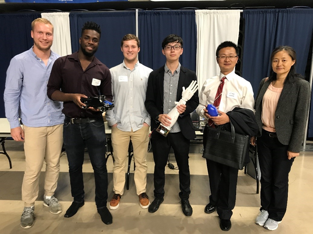 4月27日下午,本科生董凯良、龚畅阳、金鑫同学现场参与了宾州州立大学2017春季工程设计项目展,本次项目展共有来自中、美、瑞典、澳大利亚、比利时5个国家的129项项目参展,公司共有11项本科生毕业设计国际合作项目参展。龚畅阳、Beck Tuvesson等同学的项目“Remote live-video security surveillance via mobile robot with Raspberry Pi IP Camera”展出了基于移动小车平台的实时远程场景视频监控系统、利用人-机交互方法的精细抓取操作装置,跨国紧密合作形成完善的系统功能、开发的精巧装置使得该项目成为展会会场最令人瞩目驻足的项目之一。祁照岗老师指导的“Impeller Axial Movement Study”项目凭借卓越理论研究成果及视觉呈现技术获得本次展会的最佳海报奖(Best Poster Award)。