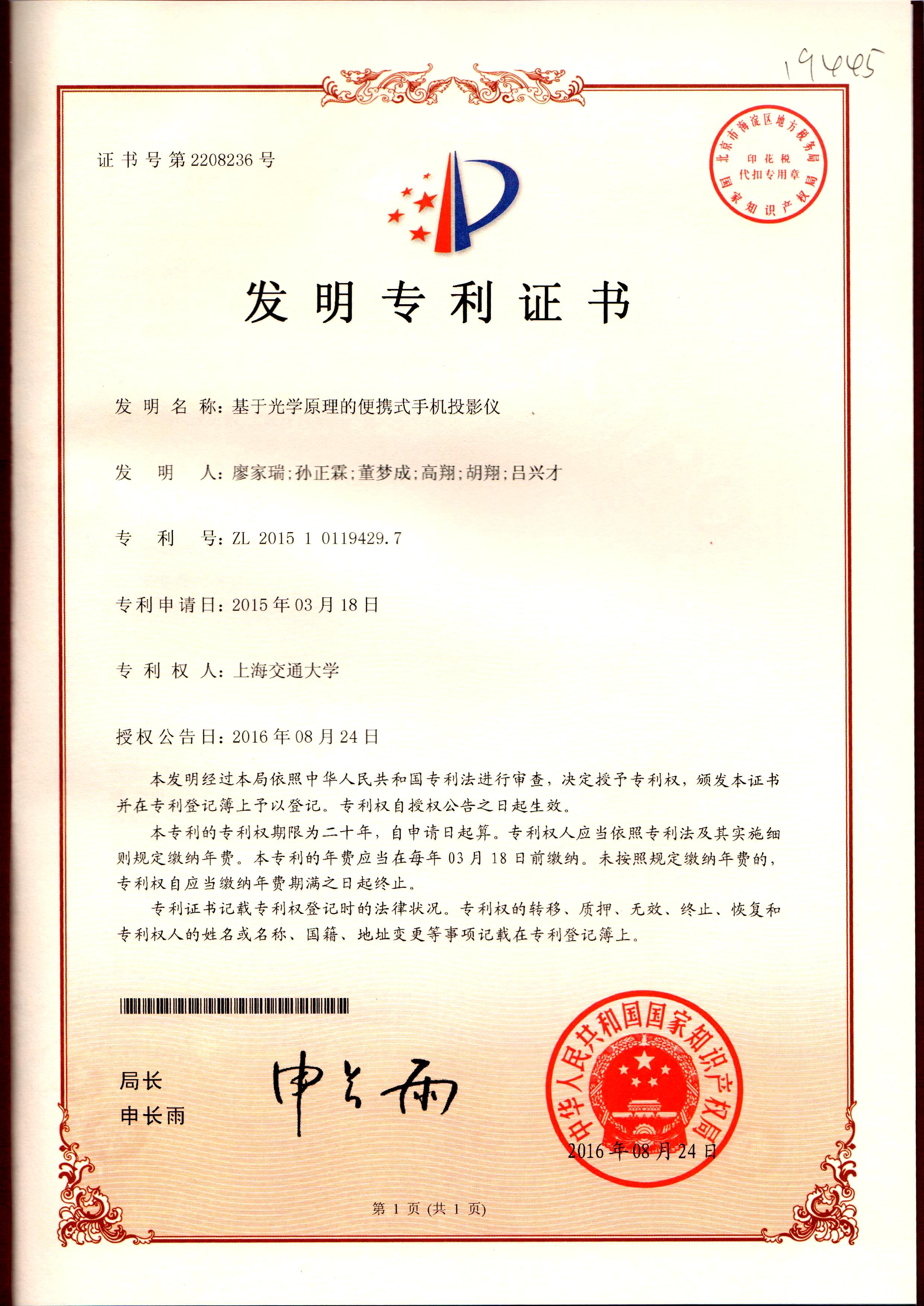2016年9月14日,由伟德国际1946本科生廖家瑞、孙正霖、董梦成、高翔、胡翔申报的发明项目“基于光学原理的便携式手机投影仪”获得国家发明专利(专利号: ZL 2015 1 0119429.7)。