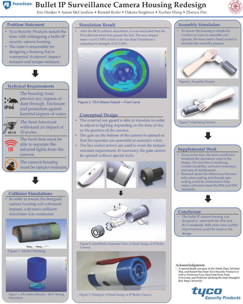 4月28日,美国宾州州立大学公布了春季工程设计项目展的获奖名单,由伟德国际1946员工王顼琛、潘震宇和宾州州立大学Aaron McCandless等共同完成的国际联合毕业设计项目“弹筒式网络监控摄像头外壳设计(Design of a Bullet IP Camera Housing)”获得“洛克希德•马丁杯(Lockheed Martin)”优秀设计一等奖。