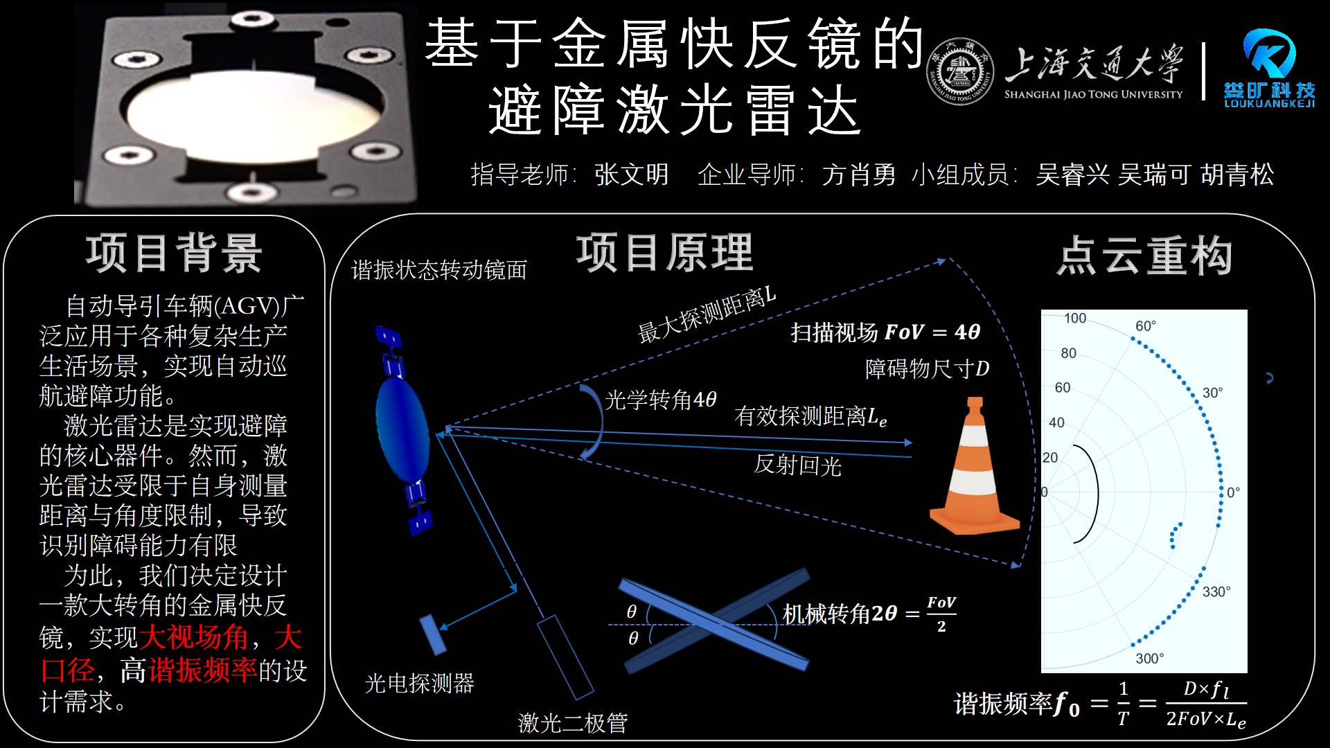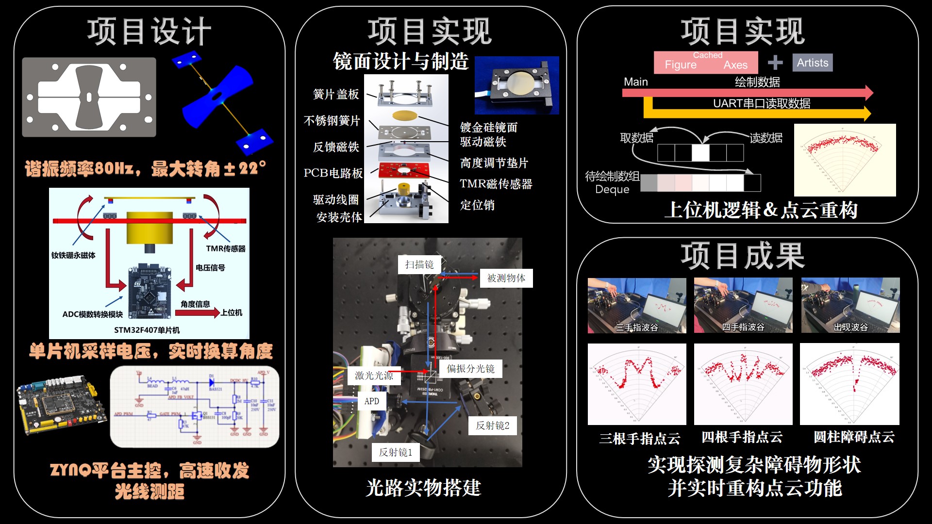 本项目提出一款基于大口径大转角的金属扫描镜,实现了更大的扫描视场和更远的探测距离。视场角在80°时工作26小时仍十分稳定。采用磁传感器实现了角度反馈,并实现了谐振式扫描镜的闭环控制。搭建了激光雷达系统光路,实现了对不同形状物体的辨识以及多物体的辨识,相同光路条件下实验对比得到本项目的20mm口径扫描镜的探测距离为5mm直径扫描镜的两倍。