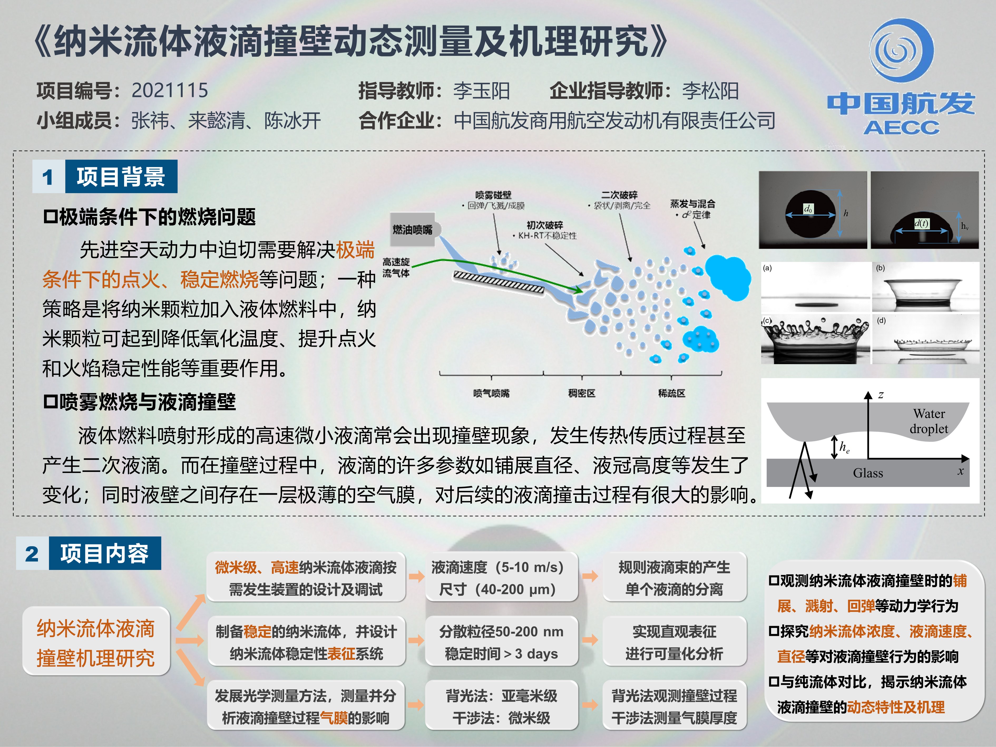 项目目标为设计一套可行的实验装置、实验及分析方法,能够进行稳定性高、分散性好的纳米流体的制备与表征,并设计一个稳定的液滴尺寸、速度等参数宽范围可调的单液滴发生器,对常规纯流体和制备所得的纳米流体等不同液体进行实验测试,同时配合背光拍摄法和干涉成像法进行纳米流体液滴撞壁的动态测量研究,获得纳米流体液滴撞壁过程的特征参数并与常规纯流体液滴撞壁实验进行对比,以此分析纳米流体液滴撞壁过程中的机理。