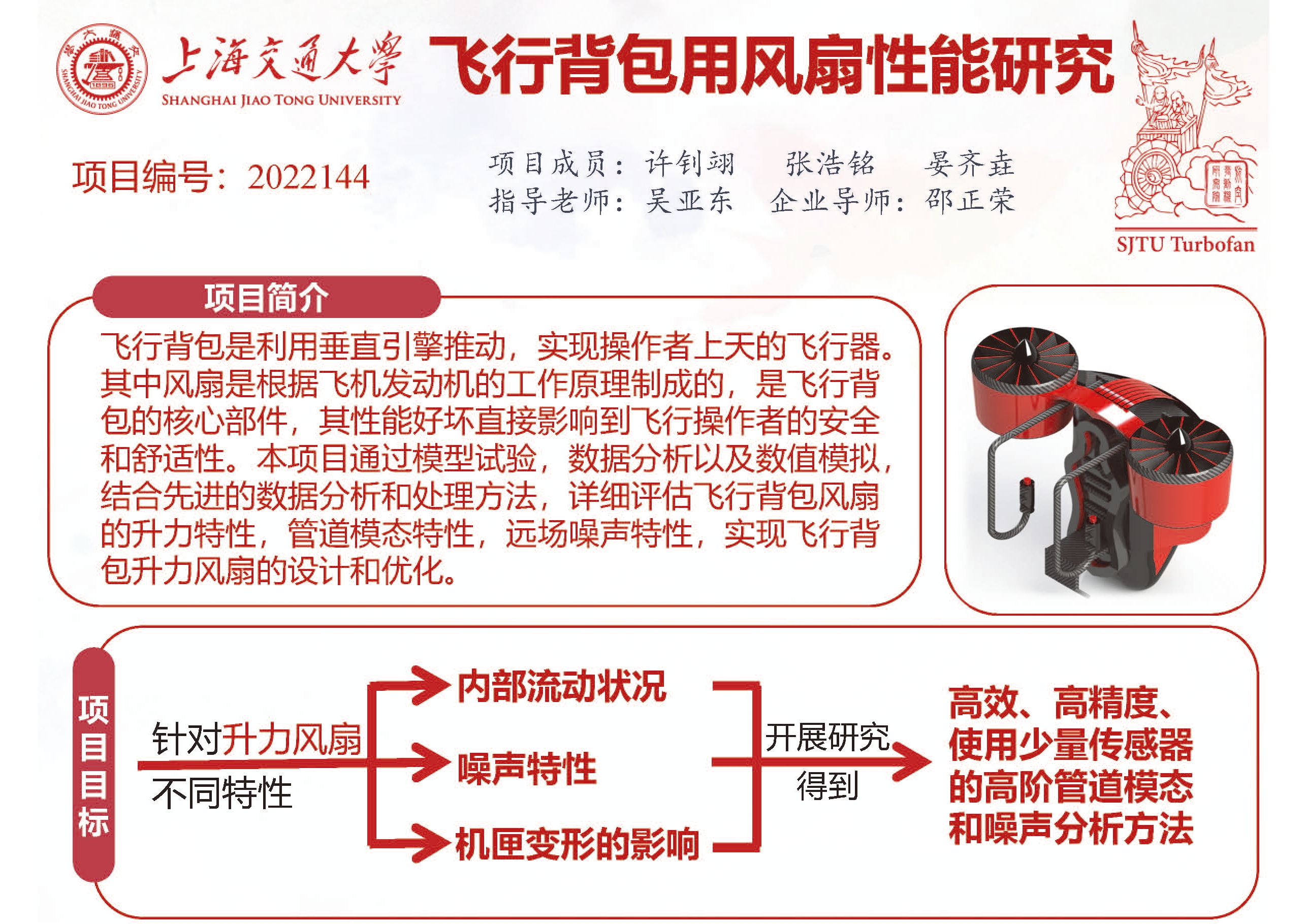 飞行背包是利用垂直引擎推动,实现操作者上天的飞行器。其中风扇是根据飞机发动机的工作原理制成的,是飞行背包的核心部件,其性能好坏直接影响到飞行操作者的安全和舒适性。本项目通过模型试验,数据分析以及数值模拟,结合先进的数据分析和处理方法,详细评估飞行背包风扇的升力特性,管道模态特性,远场噪声特性,实现飞行背包升力风扇的设计和优化。