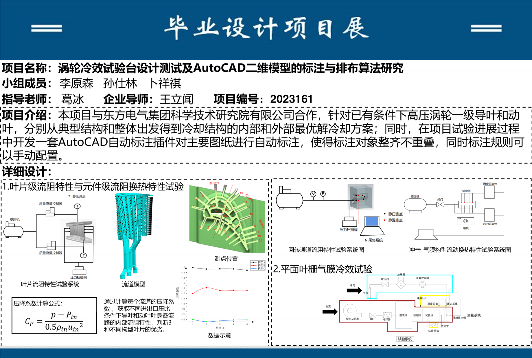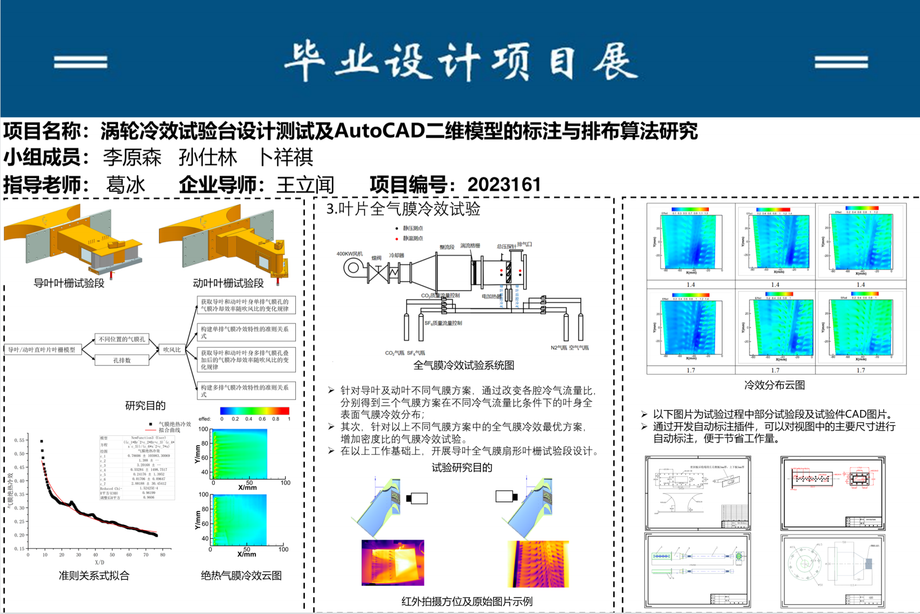 完成元件级流阻换热特性试验,获取不同进口雷诺数条件下导叶和动叶叶身模型的内部流阻特性和换热特性;完成叶片级流阻特性试验,针对三个不同内部冷却方案,获取不同进出口压比条件下导叶和动叶叶身各流路的内部流阻特性;完成单/多排孔气膜冷效试验,获取导叶和动叶叶身单排气膜孔的气膜冷却效率随吹风比的变化规律,获取导叶和动叶叶身多排气膜孔叠加后的气膜冷却效率随吹风比(流量比)的变化规律。完成叶片全气膜冷效试验,针对三个不同气膜冷却方案,获取导叶和动叶全气膜冷效随流量比的变化规律。针对试验过程中产生的图纸,对常用的零部件图纸开发一套AutoCAD自动标注插件。