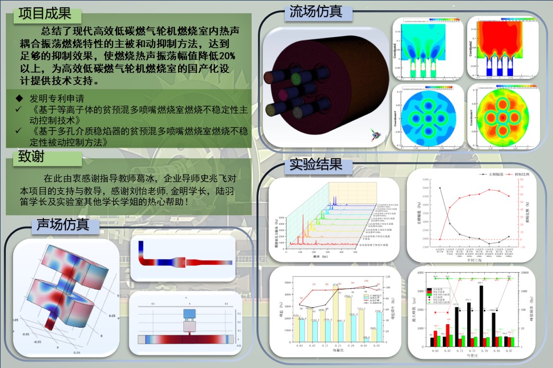 为避免产生高振幅振荡影响燃气轮机正常工作,本项目探究了多孔介质稳焰罩装置与亥姆赫兹管装置的被动控制方法以及基于等离子体的主动控制方法,完成振荡燃烧抑制实验验证,为我国高效低碳燃气轮机燃烧室的国产化设计提供技术支持。