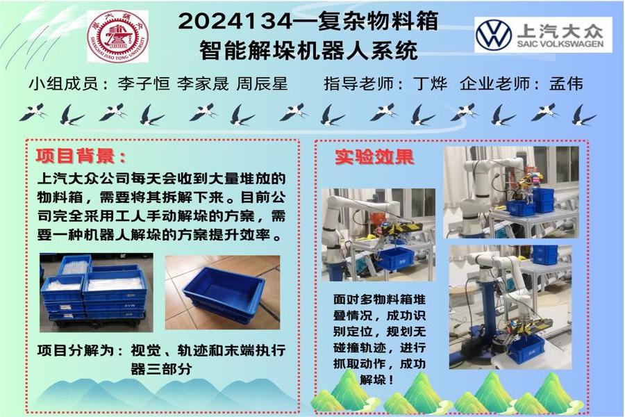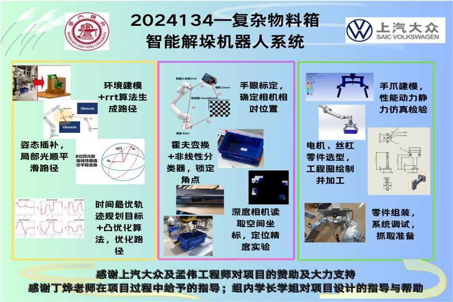 本项目源于上汽大众生产过程中遇到的实际问题:公司每天会收到大量堆放在托盘上的物料箱,需要将其逐个拆解下来。目前公司完全采用工人手动解垛的方案,然而人工解垛不仅效率低下,而且劳动强度大,安全隐患多,因此希望使用工业机器人完成解垛工作。本项目围绕物料箱解垛问题,对物料箱的识别和定位方法进行研究,设计和制造符合解垛需求的末端执行装置, 结合机器人运动学开展轨迹规划,设计制造了能够将堆垛物料箱解垛的机器人系统。