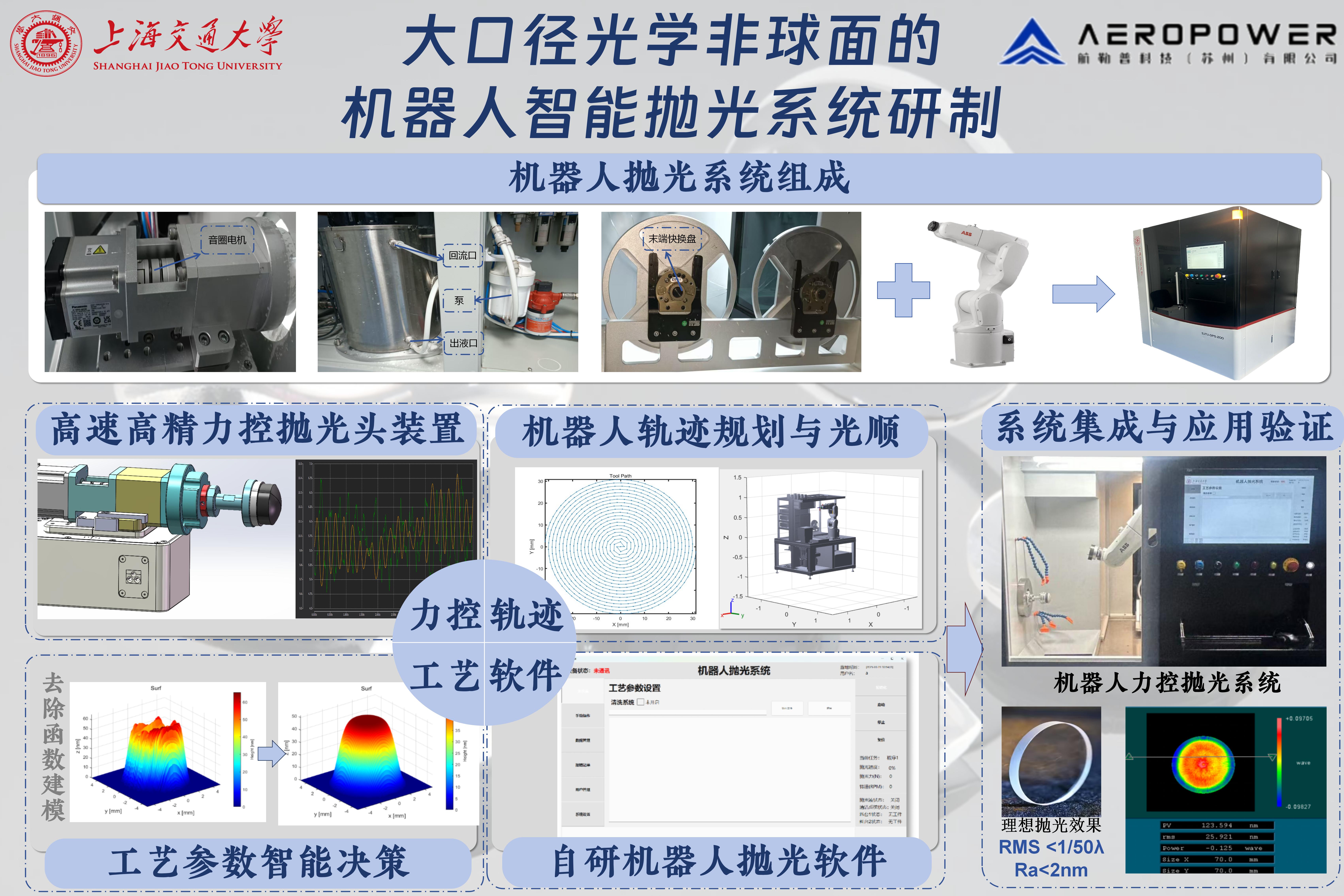 本项目拟构建面向大口径光学非球面的机器人智能抛光系统,并开发配套的工艺优化与控制软件。项目将从抛光路径规划与优化、恒力控制系统搭建与自适应智能控制算法开发、去除函数建模与工艺参数优化等方面开展研究。通过软硬件系统集成,实现对非球面表面的高效高质抛光加工。最终实现面形 RMS < 1/50λ的加工指标,推动机器人在超精密光学制造中的应用。