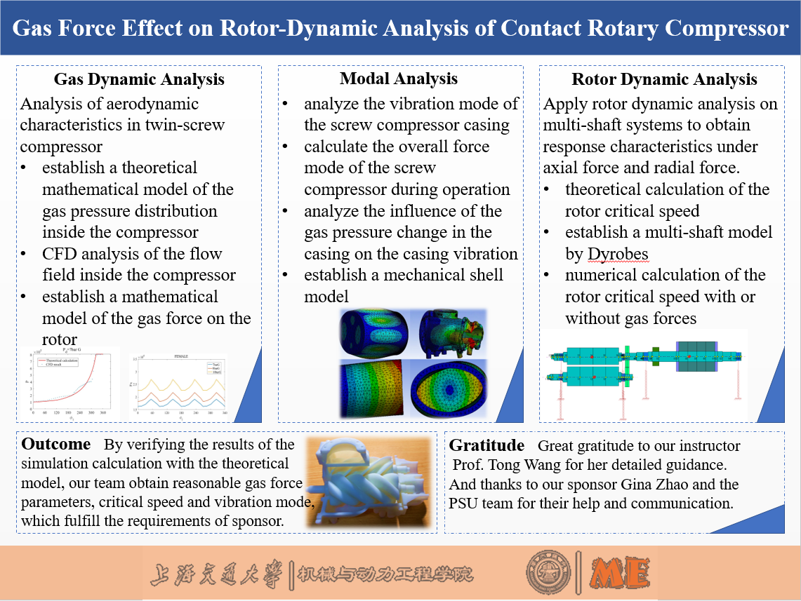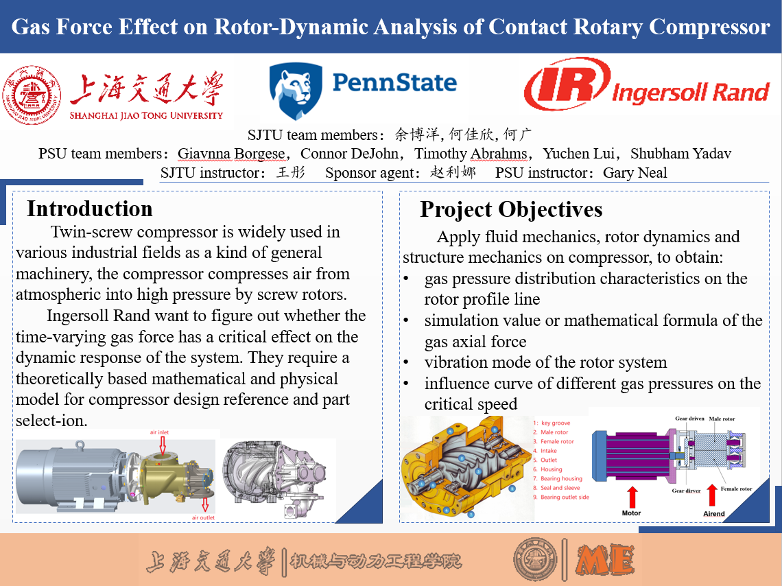Twin-screw compressor is widely used in most fields such as air conditioning, refrigeration chemical industry and water conservancy. It is one of the essential important devices in industrial production process. However, the consequence of blindly improving the compression ratio and flow rate is the vibration and noise of the twin screw-compressor, which has a great impact on the life of the compressor and causes economic losses instead. Ingersoll Rand want to figure out whether the time-varying gas force has a critical effect on the dynamic response of the system. They require a theoretically based mathematical and physical model for compressor design reference and part select-ion.