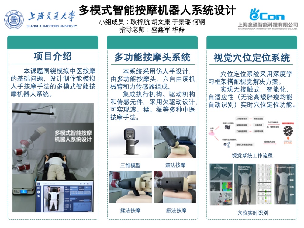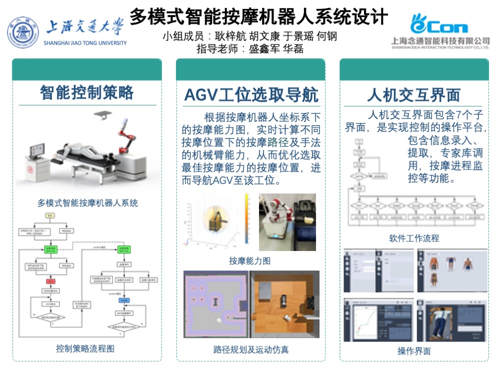 初步完成多模式智能按摩机器人系统设计与制作,基于中医理论的指导,设计智能按摩策略,完成穴位实时识别、AGV最优按摩位置选择,实现多种中医手法的按摩,可以从很大程度上弥补市场中按摩器械的缺点。初步完成医师操作软件开发,方便医师对整个按摩机器人系统的了解和使用。