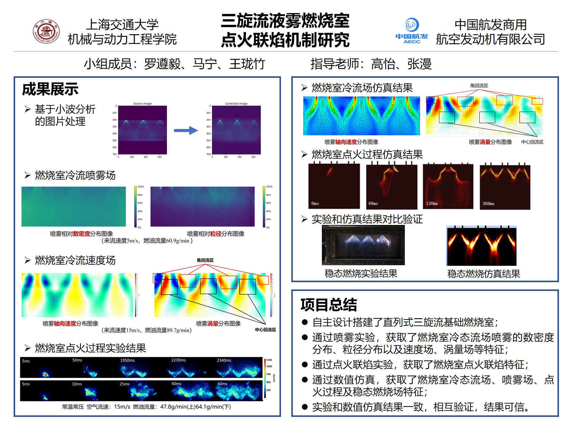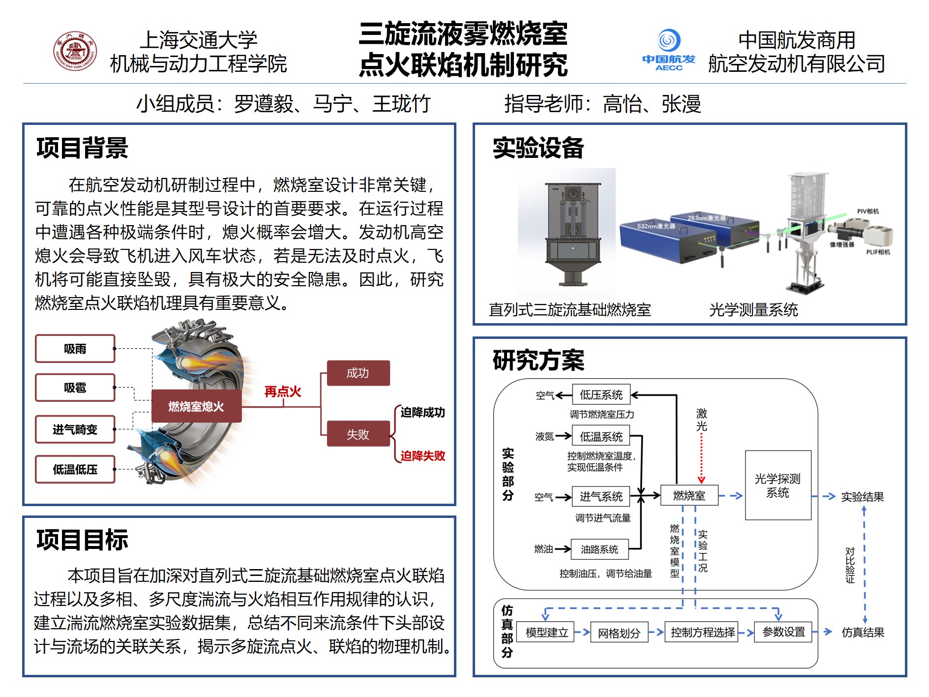 本项目在中国航发商发的资助下,设计搭建三旋流基础燃烧室试验平台,根据飞机运行的典型工况,在常温常压与低温低压两个不同环境条件下,探究燃烧室点火联焰特征及火焰流场相互作用规律。
