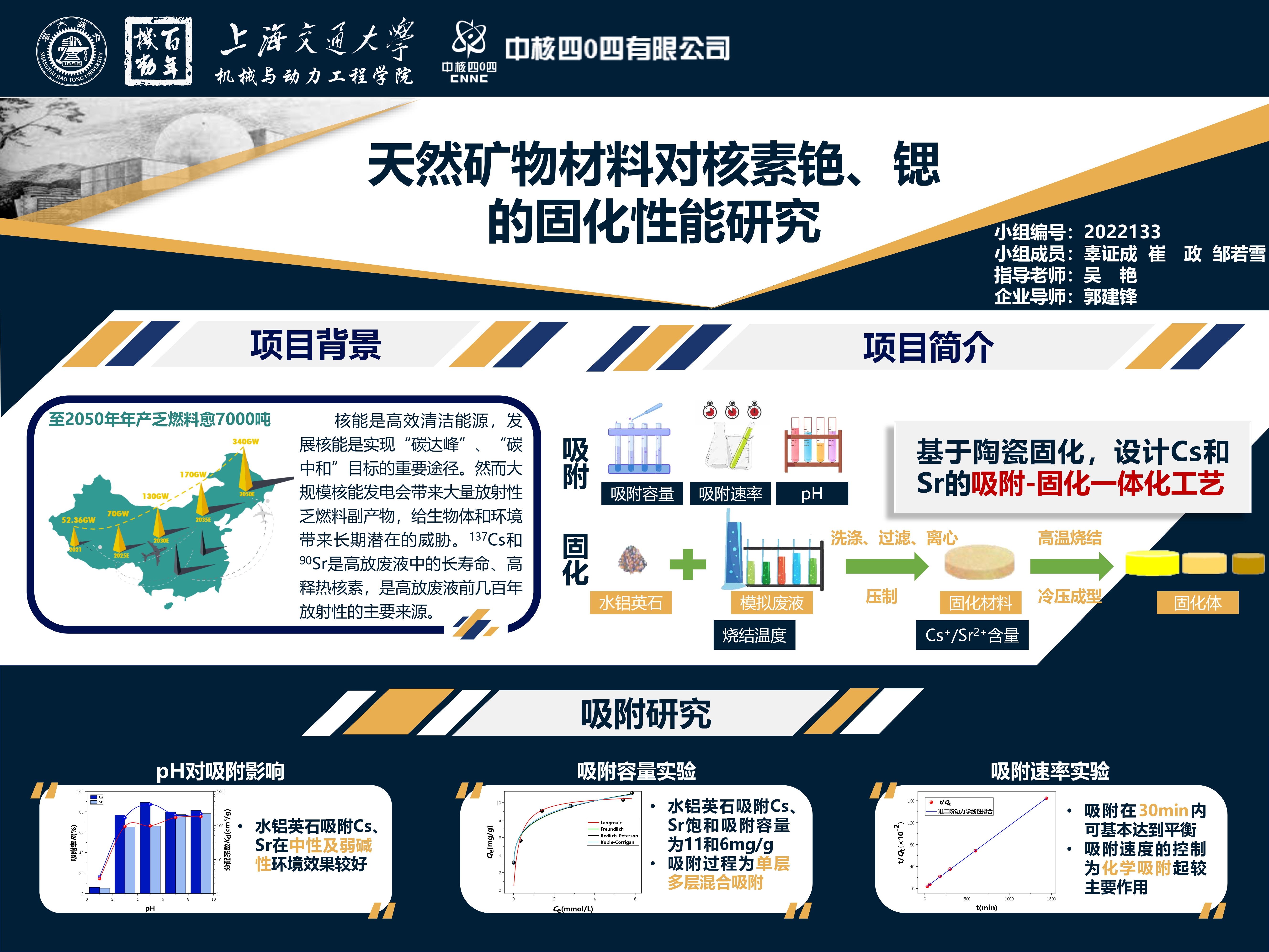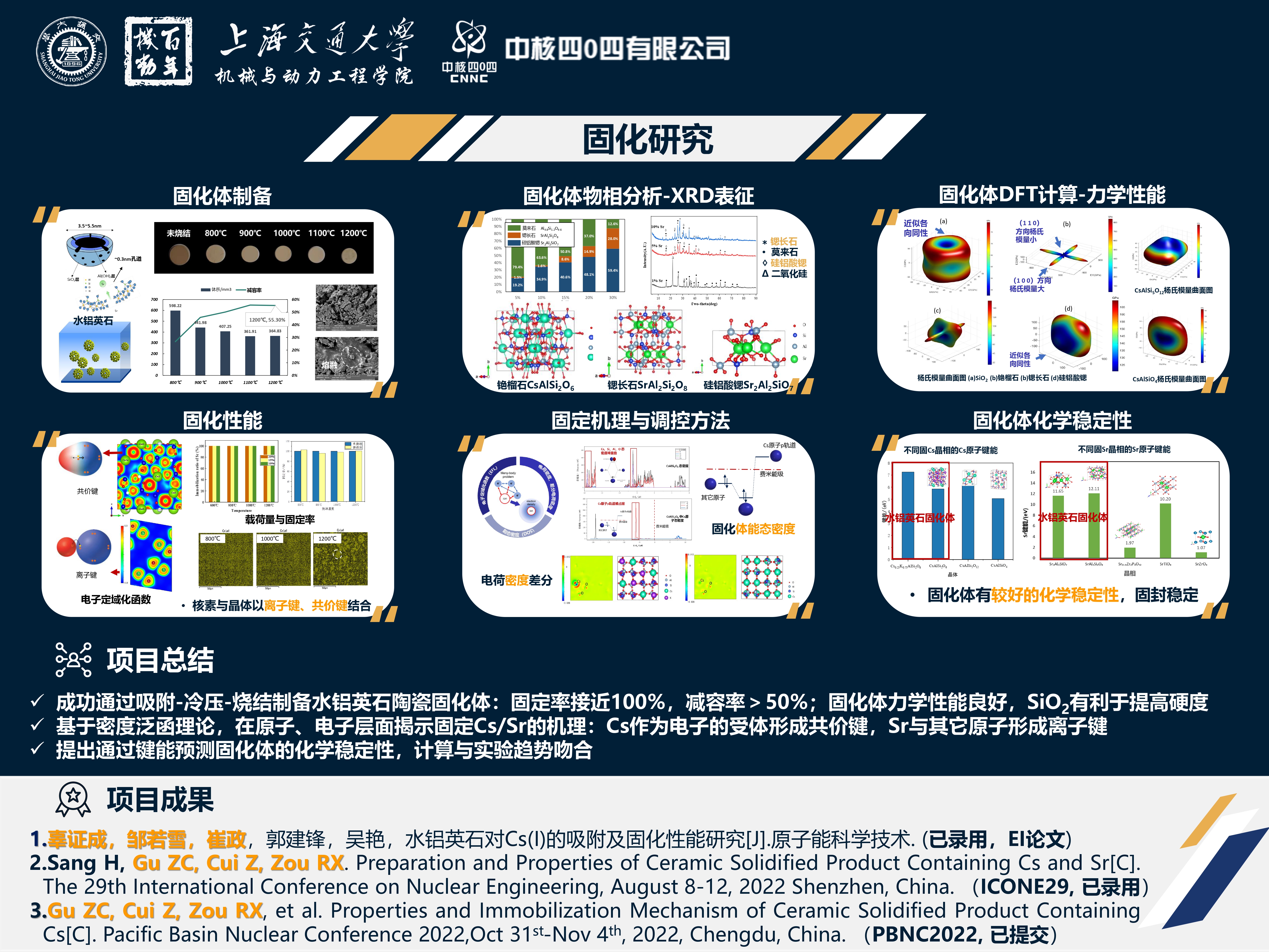 核电是重要的清洁电力来源,然而在核燃料循环过程中会产生大量的放射性废物,对环境和生物带来极大的潜在危害。137Cs90Sr的半衰期约为30年、高释热,是乏燃料前一百年主要的放射性来源。将137Cs90Sr从高放废液中分离出来、稳定固化有利于保证其长期处置安全,本项目针对CsSr的分离、固化,本项目旨在研究核素CsSr的吸附-固化一体化工艺,获得相关基础数据,并满足吸附容量、CsSr固定率、力学性能、化学稳定性方面的要求。