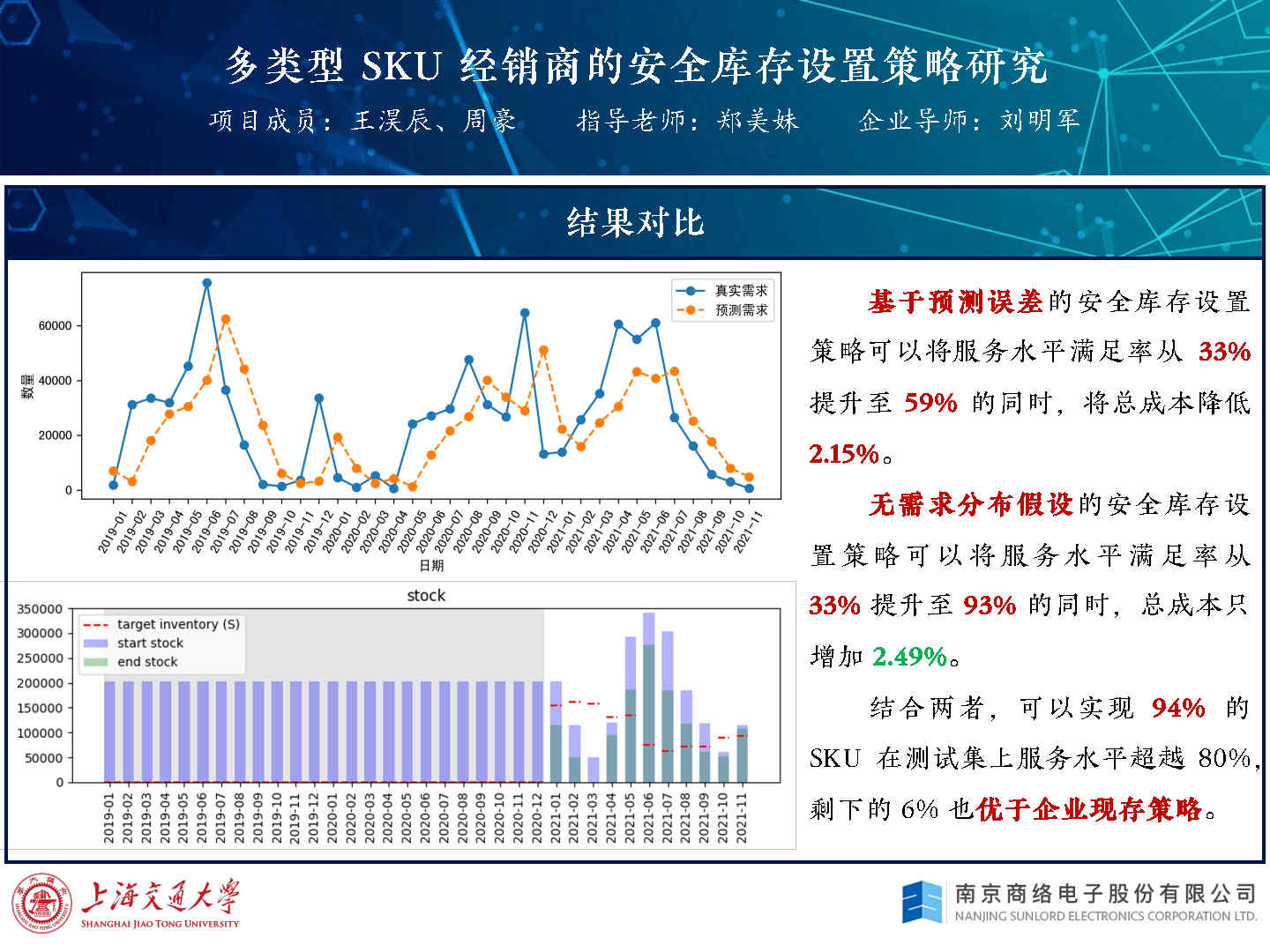 项目将处理后的月需求分别通过基于预测误差的模型输出安全库存,以及无需求分布假设的模型输出目标库存水平;然后,基于模型的输出,设置相应的库存控制策略;最后,项目在真实的仿真环境中,与企业现行库存策略进行比较,验证两套方案的安全库存数量设置合理性,并且从需求方差和需求变化趋势两个方面,归纳不同方法的适用范围。