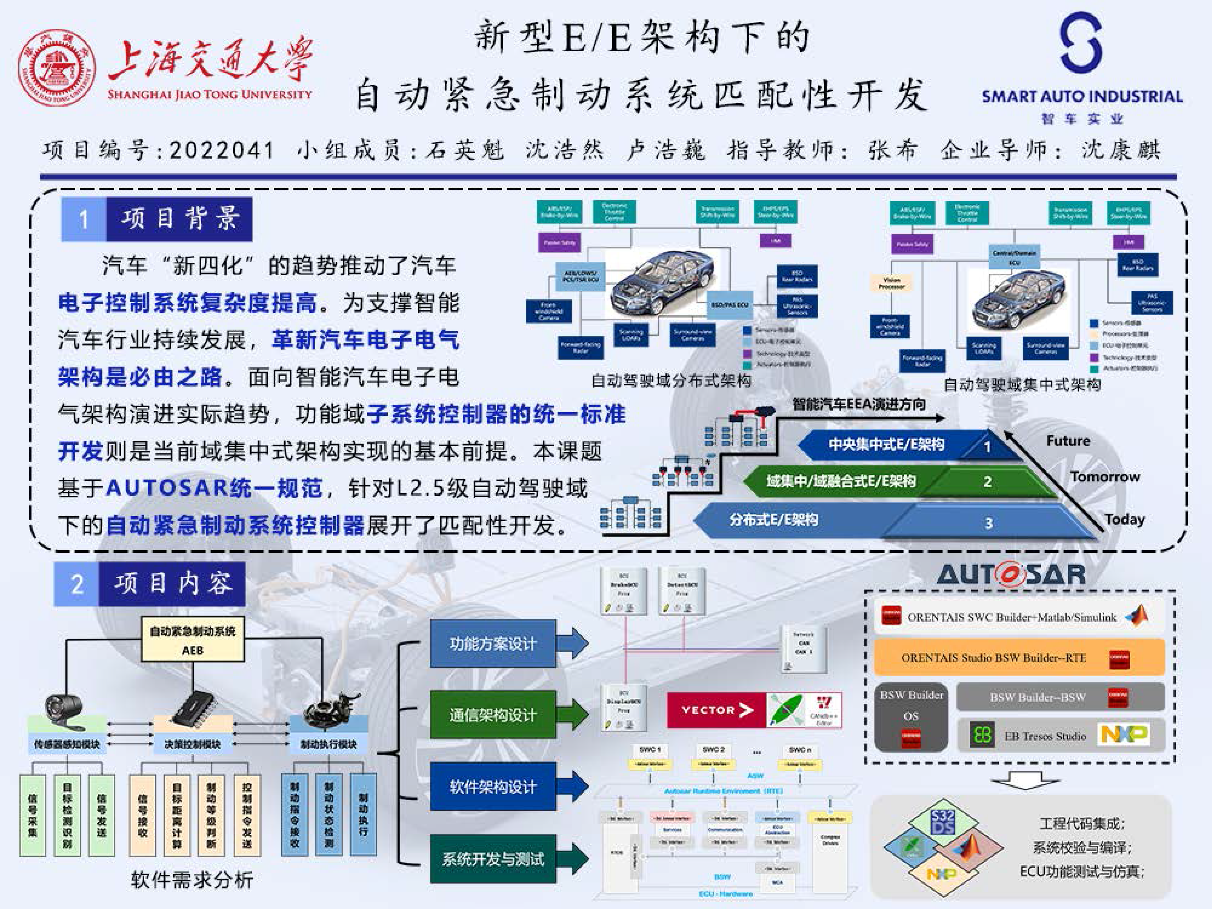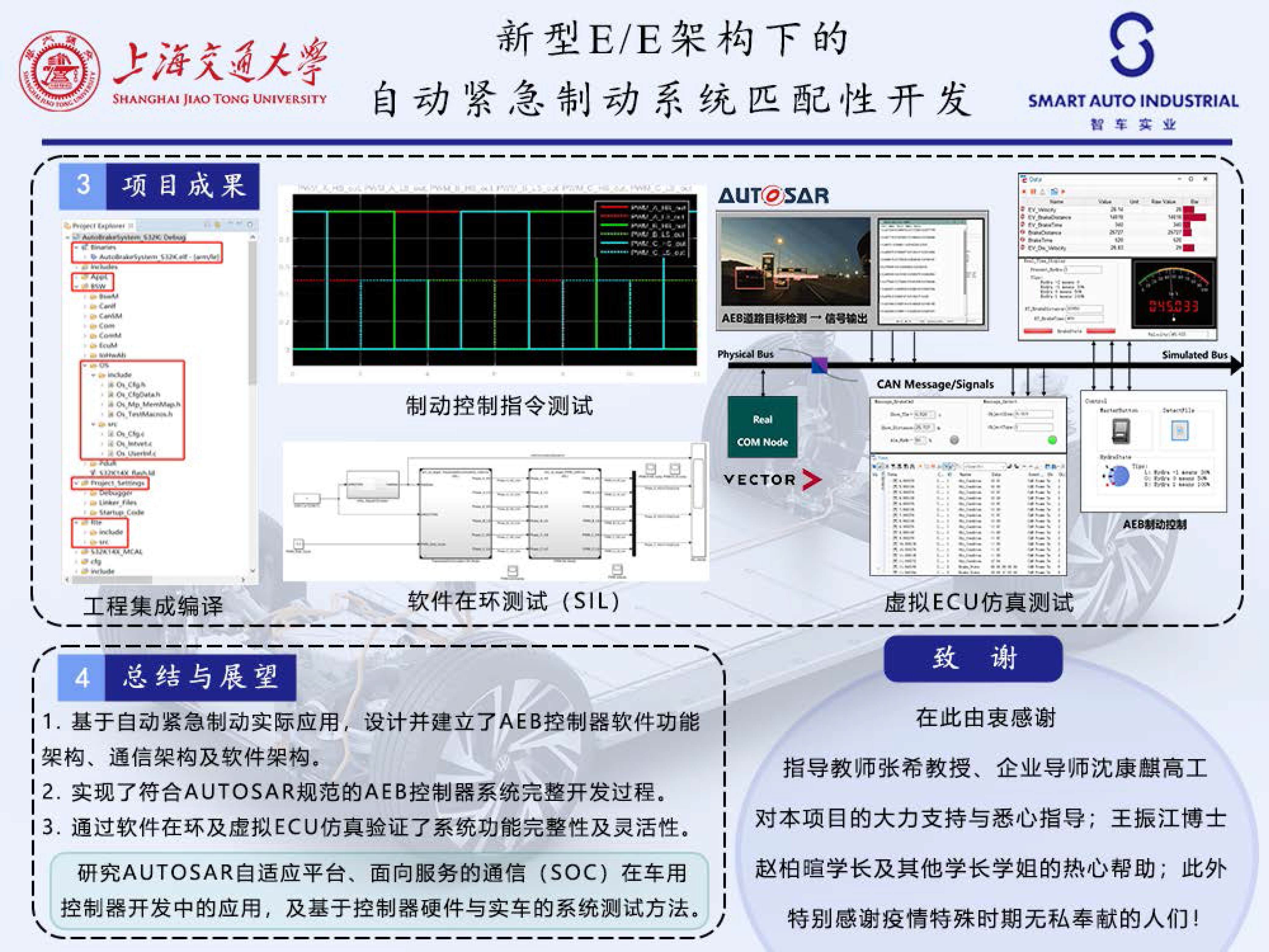汽车“新四化”以及“软件定义汽车”趋势的不断深化使得智能汽车系统复杂度提高,汽车电子电气架构革新成为必由之路,而功能域各子系统的统一标准开发与控制器融合是实现E/E架构向集中式演进的前提。因此,本项目面向L2.5级自动驾驶的域集中式EEA发展,以自动紧急制动系统为研究对象,设计开发了一套完整的融合自动驾驶感知算法与基础决策控制模型、符合AUTOSAR国际统一标准的控制器软件平台,并对系统模型进行了测试验证,为智能汽车E/E架构演进提供了支持与实践。