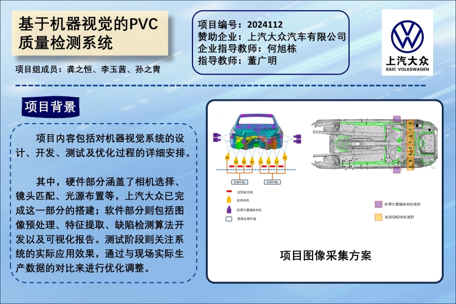 项目计划包括对机器视觉系统的设计、开发、测试及优化过程的详细安排。其中,硬件部分涵盖了相机选择、镜头匹配、光源布置等,上汽大众已完成这一部分的搭建;软件部分则包括图像预处理、特征提取、缺陷检测算法开发以及可视化报告。测试阶段则关注系统的实际应用效果,通过与现场实际生产数据的对比来进行优化调整。开发一套基于机器视觉的汽车PVC质量检测系统,对汽车PVC组件的生产质量进行准确、高效的检测。