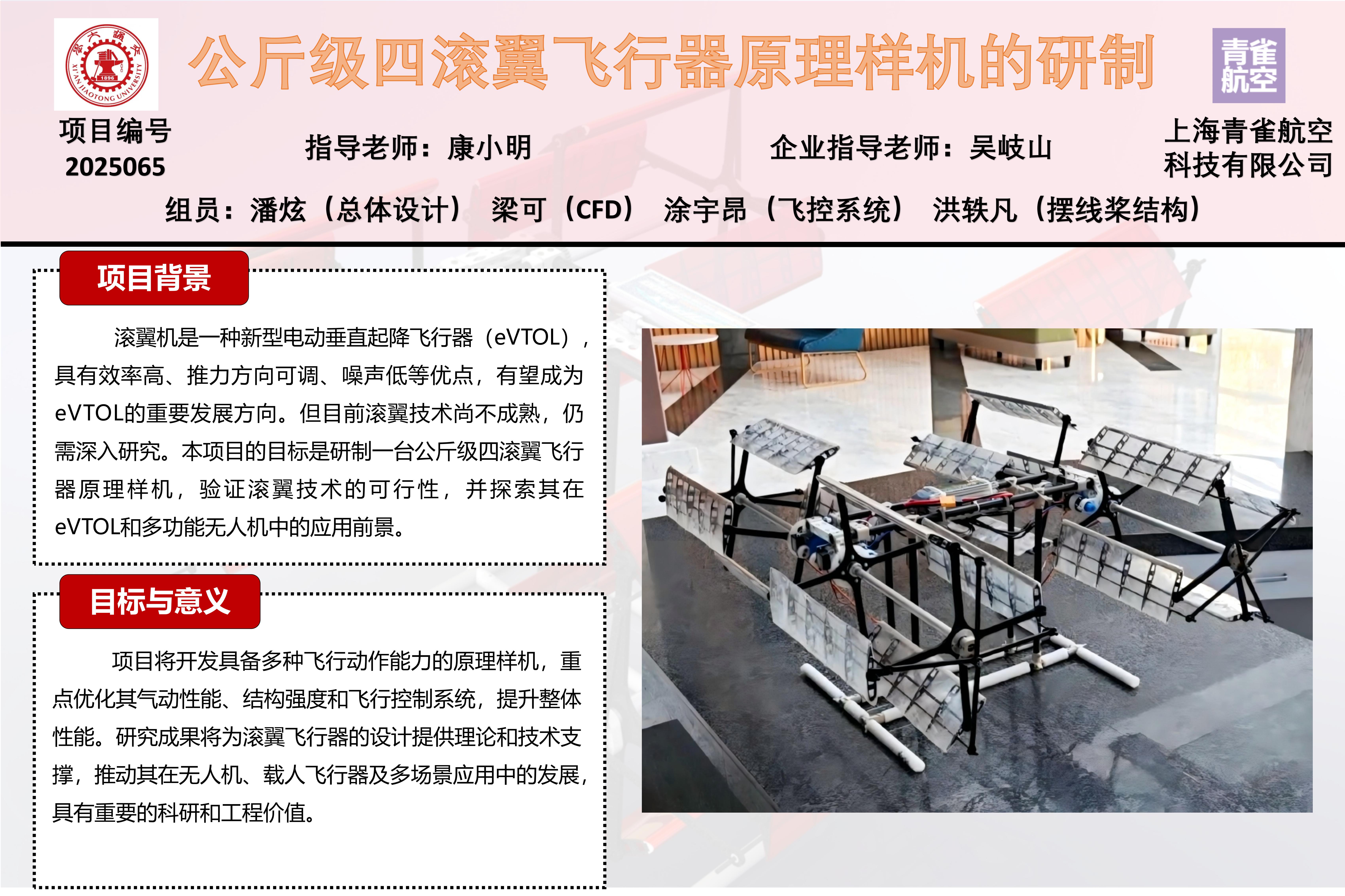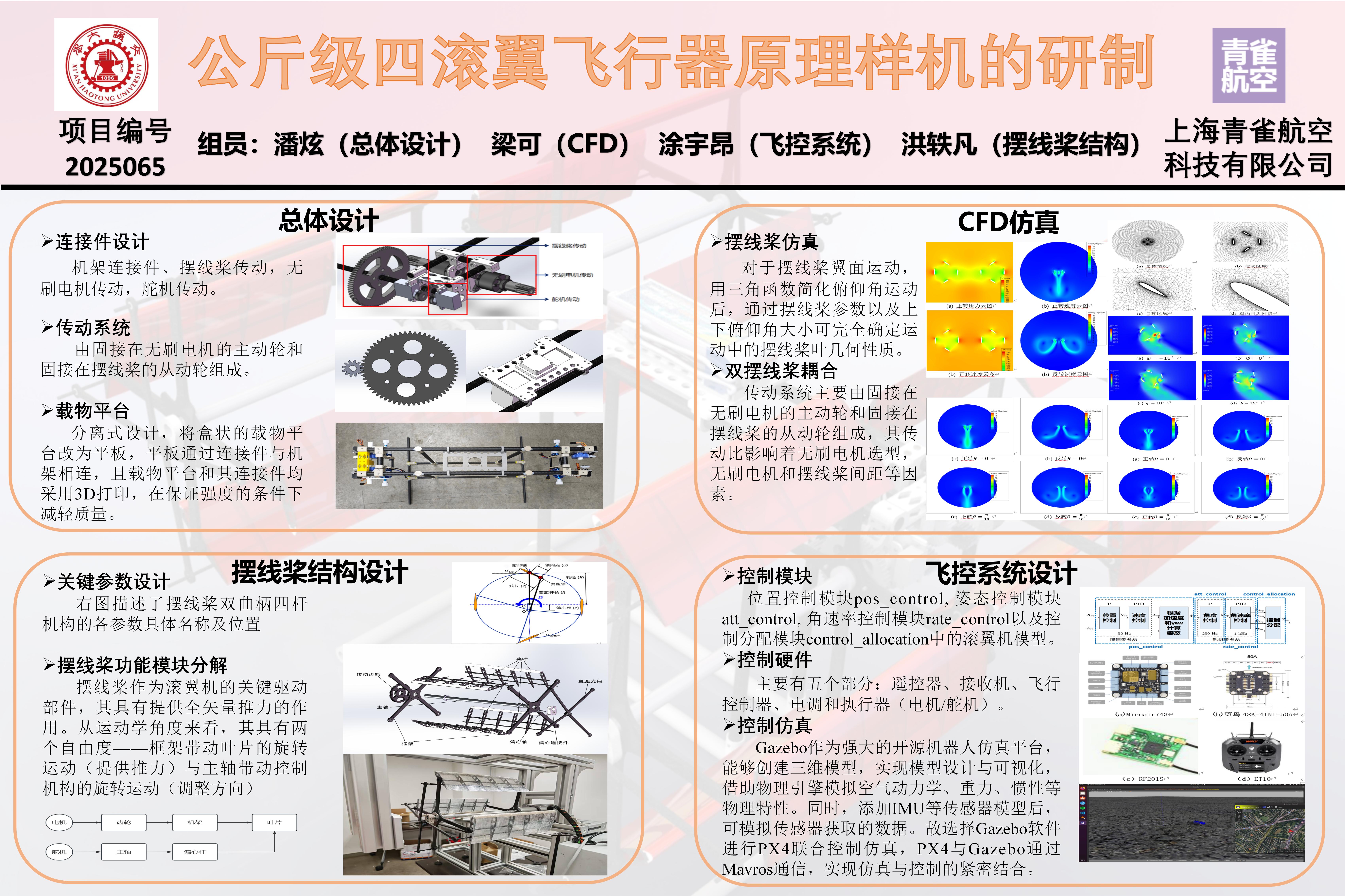 本项目成功完成了公斤级四滚翼飞行器原理样机的设计、制造与测试,构建了涵盖总体设计、摆线桨机构、气动仿真与控制算法在内的完整设计体系。项目设计的飞行器尺寸合理、质量控制得当,采用碳纤维等轻质材料实现轻量化目标,并通过有限元与CFD仿真优化结构与气动性能。完成了对单摆线桨的气动力学仿真实验,得到其2000rpm转速下的升力为13.6N,该成果验证了滚翼技术在微型飞行平台中的工程可行性,为新型电动垂直起降飞行器的发展提供了重要参考。