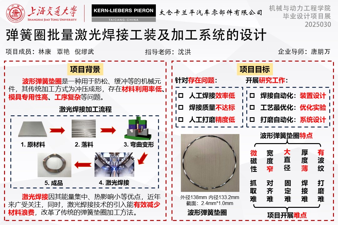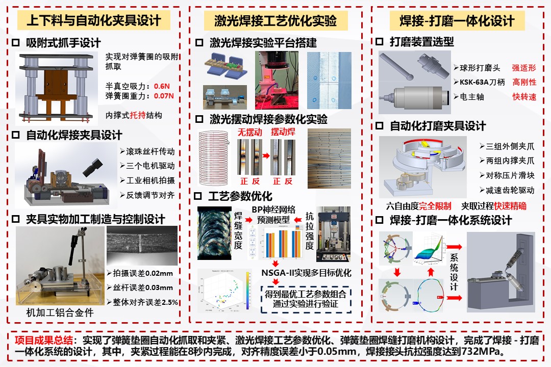 本项目针对项目需求和项目难点,设计了一套弹簧垫圈上下料机构与自动化夹具,进行了运动仿真和实物的制作;通过激光焊接工艺优化实验,形成了一套优化的激光焊接工艺参数组合,焊接接头抗拉强度达730Mpa;设计了一套弹簧垫圈焊缝的打磨机构,并完成焊接-打磨一体化装置的系统设计。