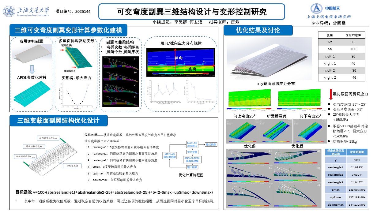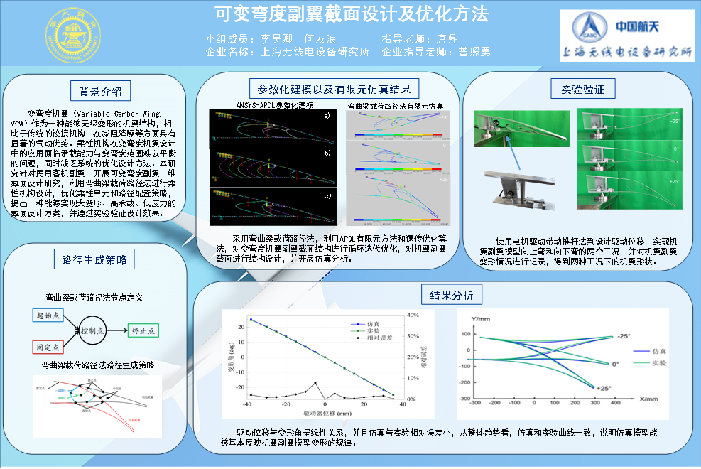 本项目基于柔性机构设计理论,提出一种三维变截面可变弯度机翼后缘结构的设计方法。针对商用客机副翼,使用改进的载荷路径法,设计出了一种二维变弯度副翼截面,并在此基础上完成了三维变截面可变弯度副翼结构优化设计,获得了一种大变形、高承载、低应力的三维变弯度副翼结构,并制造了样机,完成了变弯度功能验证实验,给出了开环驱动方法。
