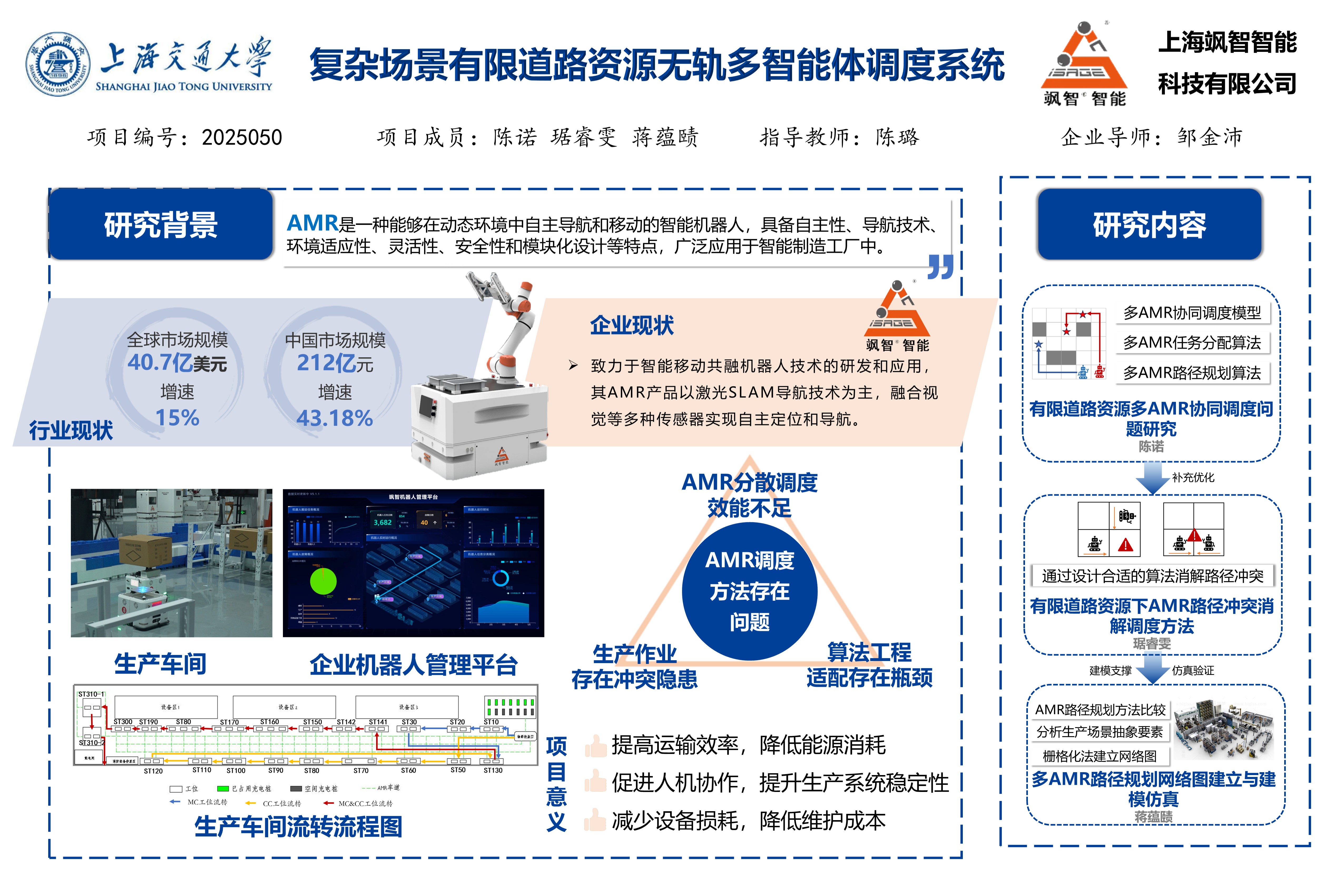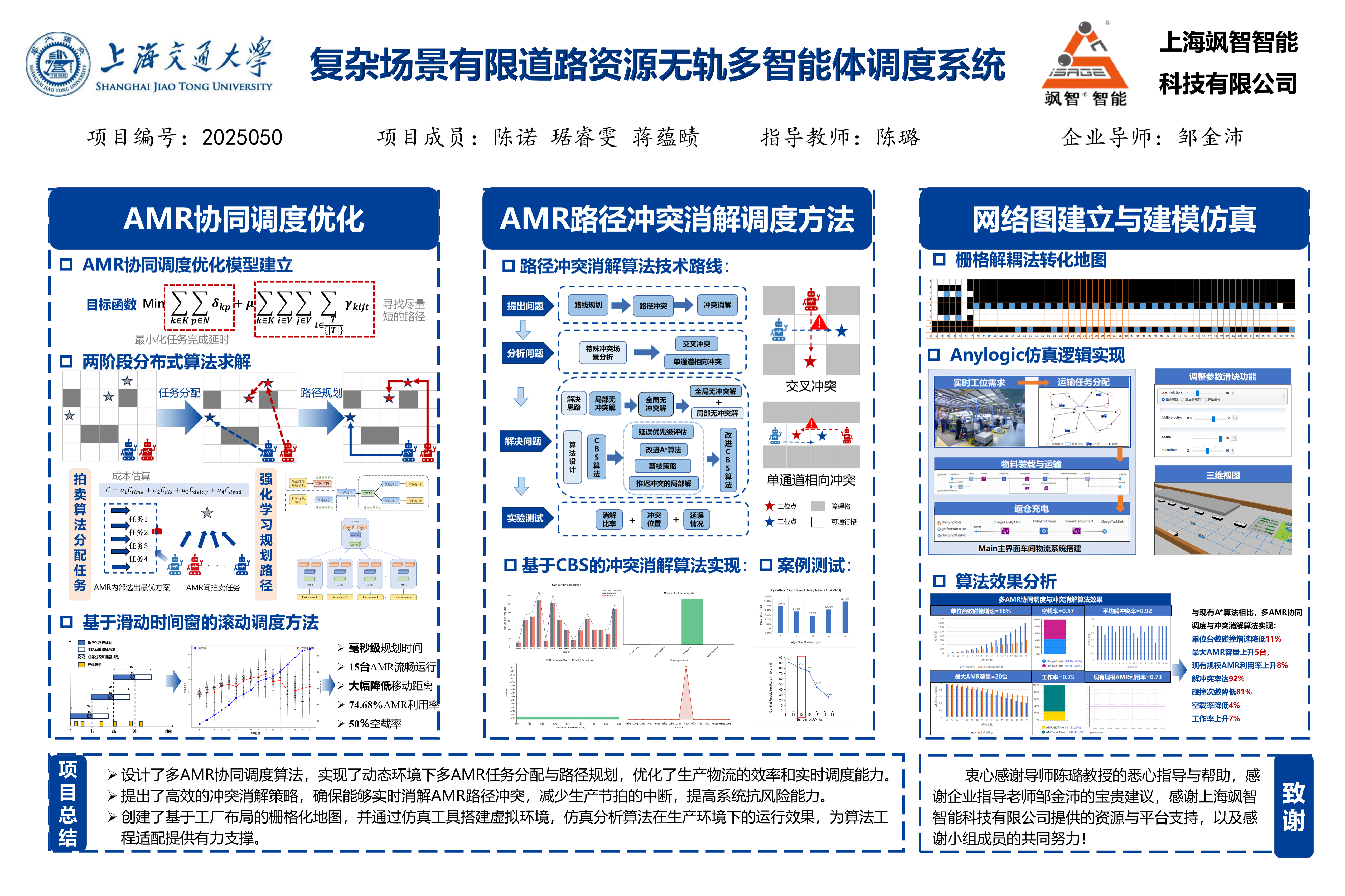 1.    开发有限道路资源下多 AMR 协同路径规划,提升计算效率与响应速度,实现任务自动分配与路径规划。