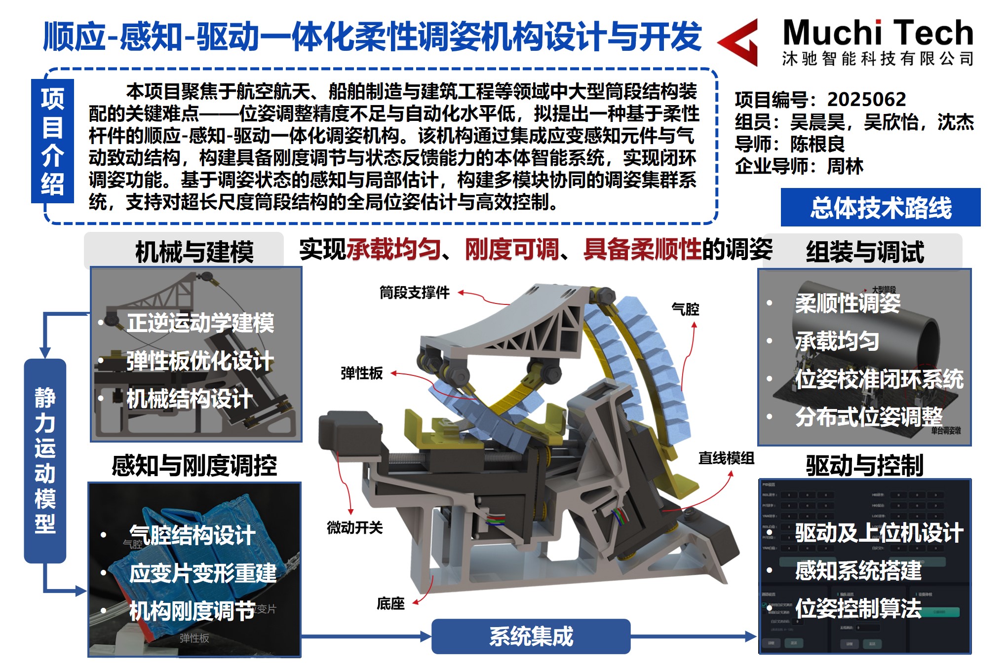 本项目聚焦于航空航天、船舶制造与建筑工程等领域中大型筒段结构装配的关键难点——位姿调整精度不足与自动化水平低,拟提出一种基于柔性杆件的顺应-感知-驱动一体化调姿机构。该机构通过集成应变感知元件与气动致动结构,构建具备刚度调节与状态反馈能力的本体智能系统,实现闭环调姿功能。基于调姿状态的感知与局部估计,构建多模块协同的调姿集群系统,支持对超长尺度筒段结构的全局位姿估计与高效控制。