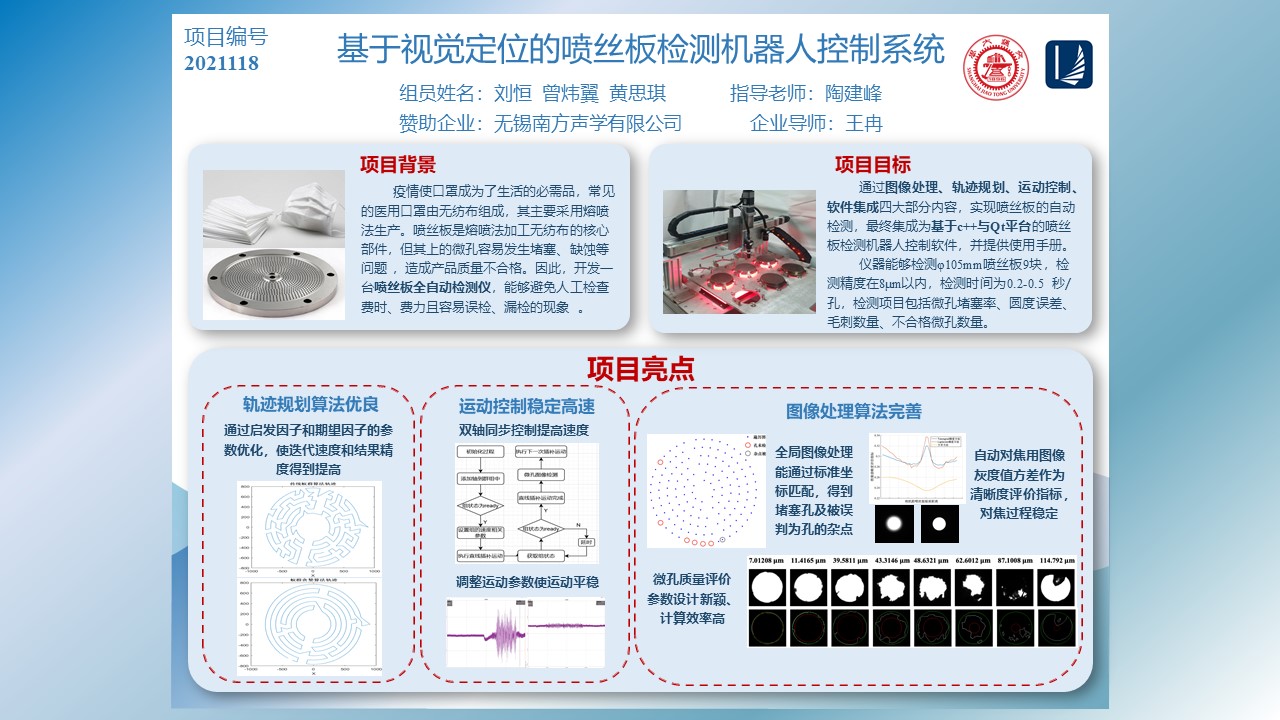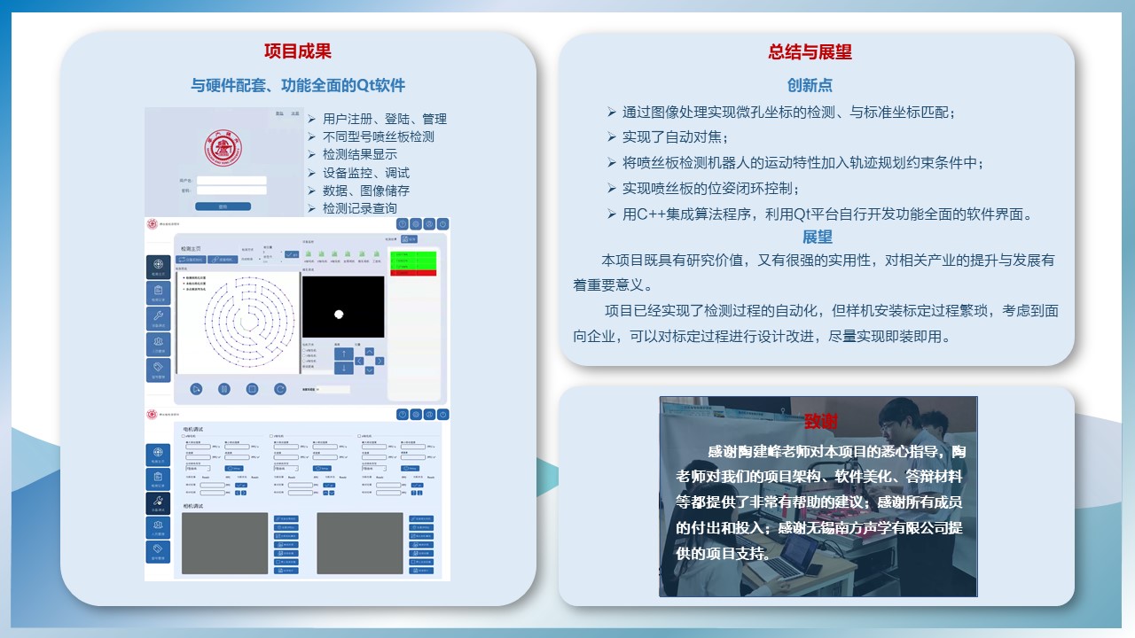 图像处理部分完成了图像处理算法的编写,实现了喷丝板上微孔的全局坐标匹配、微孔的自动对焦以及微孔堵塞率的判断;轨迹规划部分实现了遍历微孔的最优路径获取并传递给运动控制;运动控制部分实现了遍历微孔的快速稳定,且有效抑制了振动。