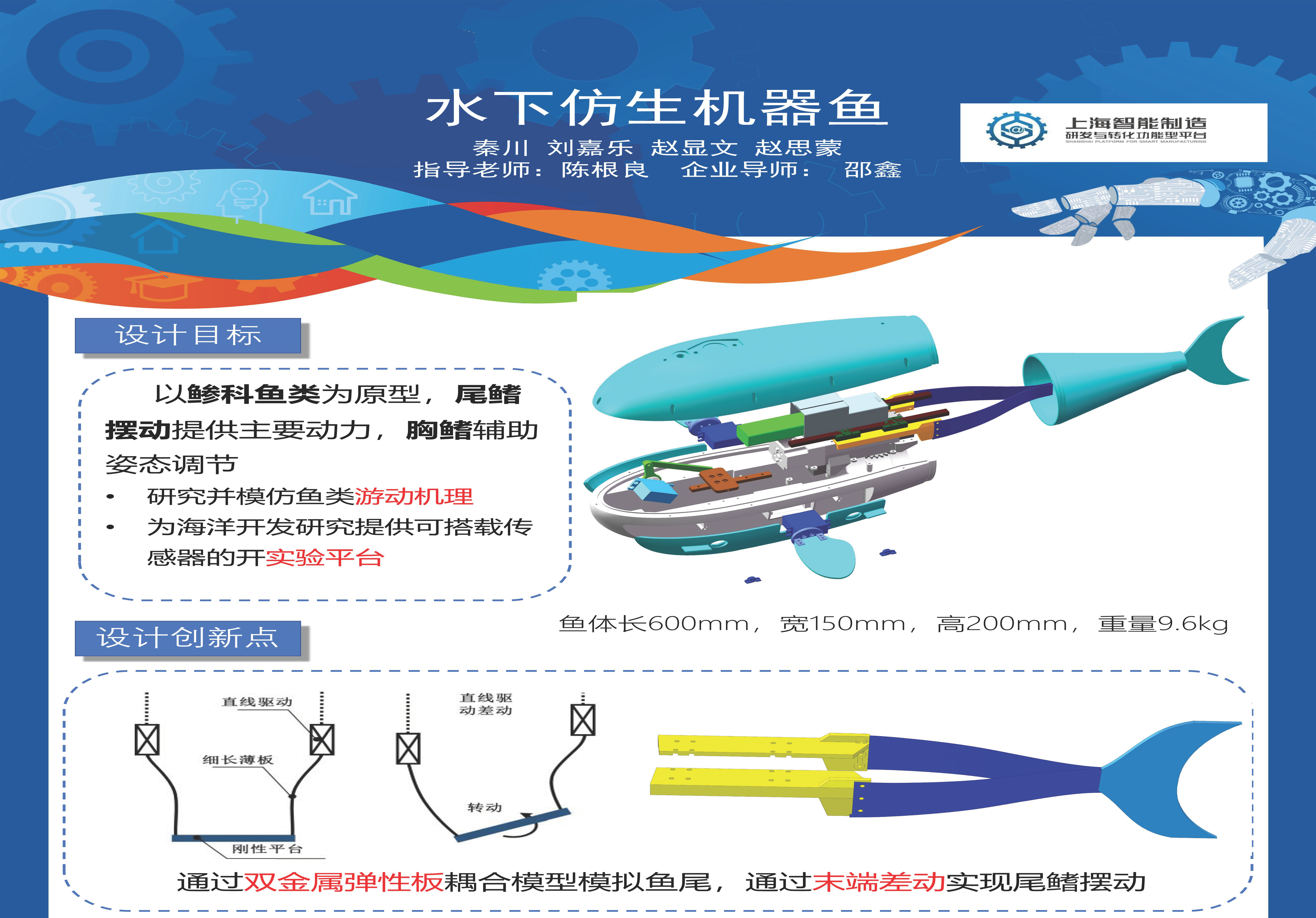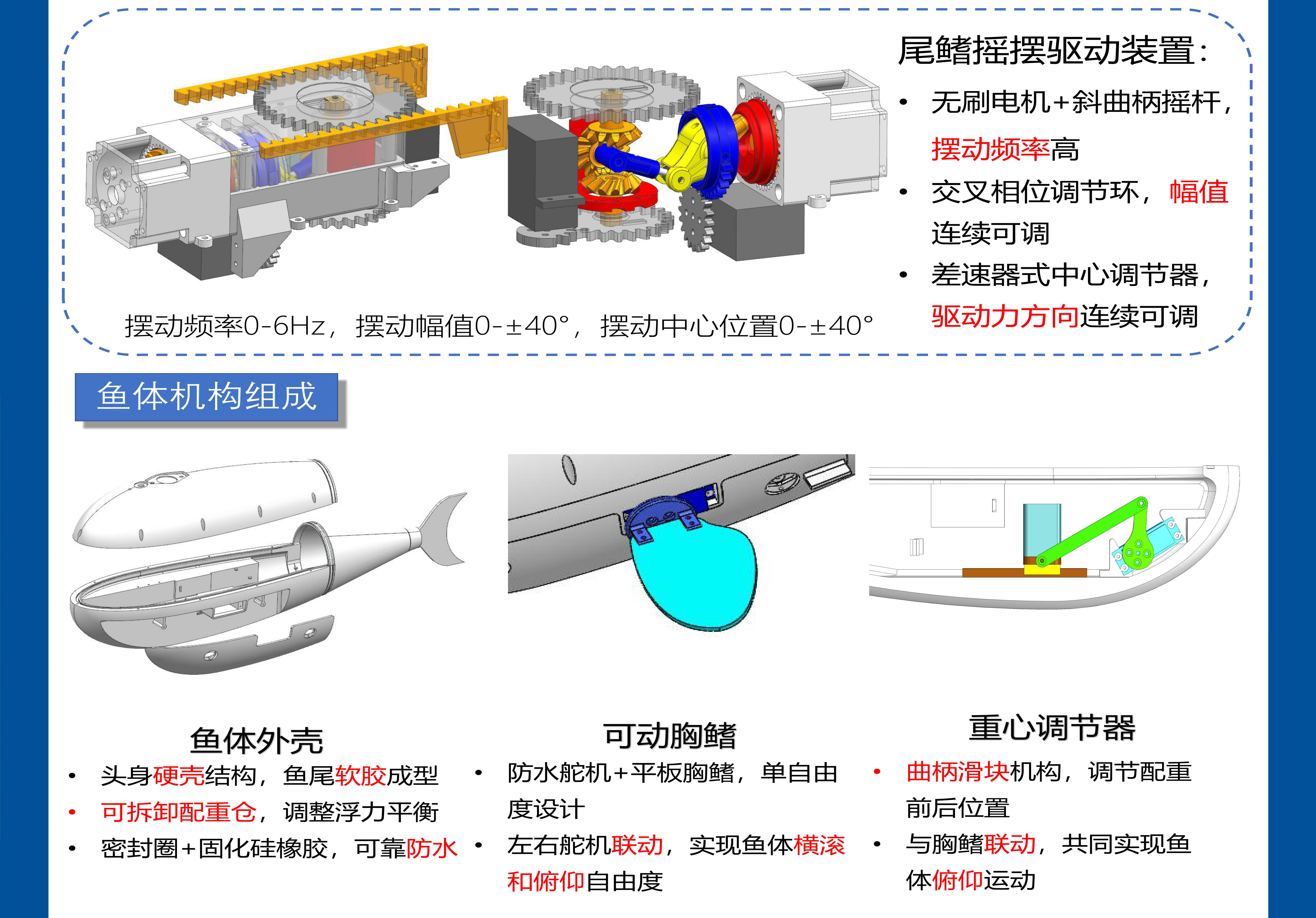 本项目以鲹科鱼为放生对象,目标是通过弹性板变形运动来拟合现实中鱼类游动时鱼体的运动函数,并附加姿态调整功能。