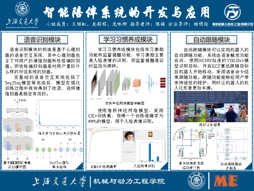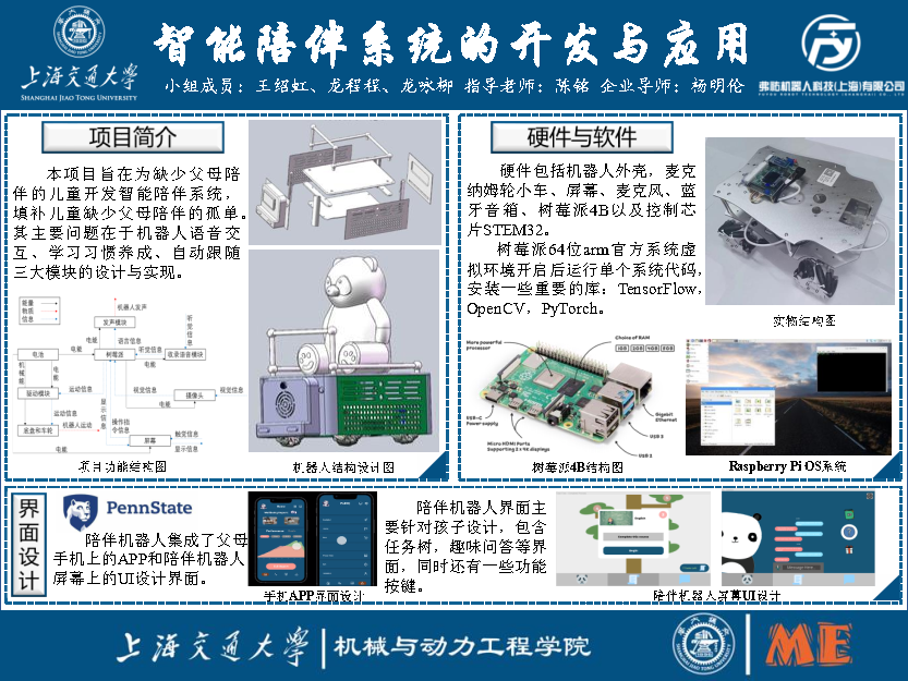 本项目设计了一款智能陪伴机器人,对产品的三个主要模块都完成详细设计、代码编写和规划加工。最终本项目在各部分都取得了一定的成果。语音交互模块可以进行语音对话,语音生成和识别的平均时间小于0.5s,单轮对话平均运算时间为1s左右。学习习惯养成模块可以进行学习激励,表情识别准确率大于80%,激励反馈时间小于0.5s。自动跟随模块可以跟随用户移动,目标识别每帧平均时间为0.1s,直线移动最低平均速度为471mm/s。此外本项目还完成了样机的制造和监控功能,父母可以对儿童通过视频进行安全监控。
