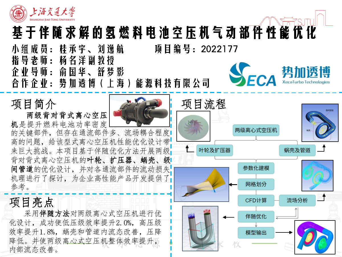 空压机是氢燃料电池系统的关键部件,而电机直驱离心式压气机凭借其高效率等特点成为燃料电池系统的首选。为了克服轴向力和电机转速限制问题,两级背对背式离心压缩机成为广泛应用的一种布局形式。然而该型离心压缩机存在两个串联的离心叶轮和蜗壳,以及较长的级间管道,部件之间性能相互影响,因而对设计提出了新的挑战。本项目基于伴随优化方法针对氢燃料电池一型背对背式两级离心式空压机的叶轮、扩压器、蜗壳和级间管道等气动部件开展优化设计。