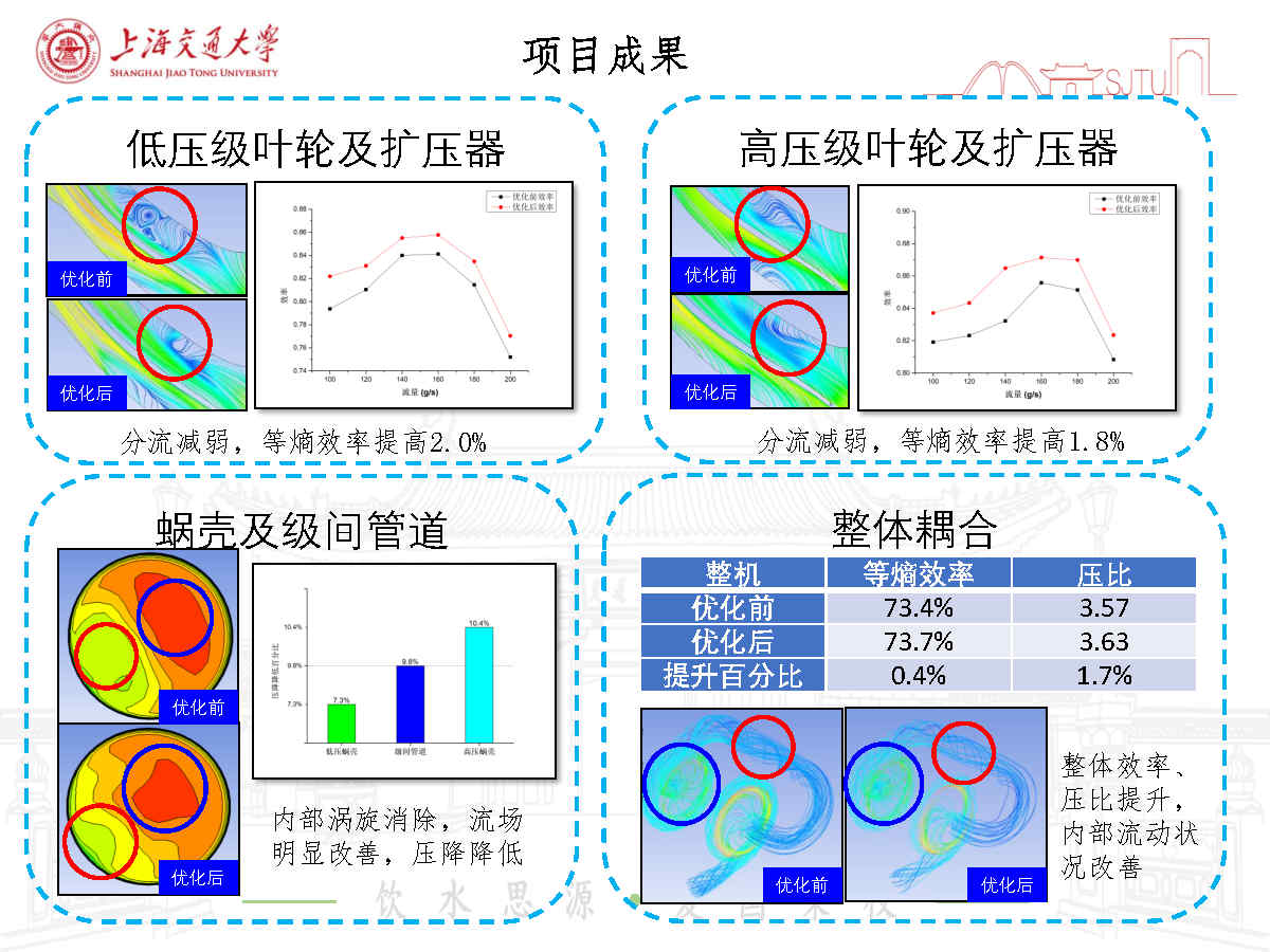 4、 进行了整体耦合计算,优化后效率提升了0.4%,压比提升了1.7%,内部流态明显改善。
