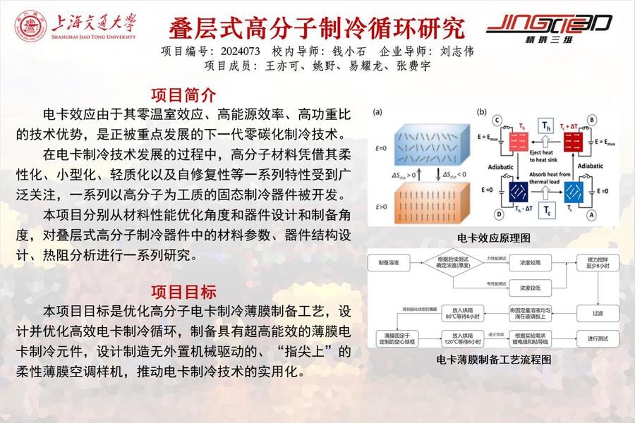 本项目目标是设计与制造全新一代全固态、叠层式、高能效、零碳排放的电卡制冷系统样机。基于巨电卡效应的物理原理,设计并制备具有高电-热转换效率的高分子电卡制冷复合材料,探究复合材料中亚纳米-纳米-微米跨尺度结构-效应关系,优化高分子电卡制冷薄膜制备工艺,设计并优化高效电卡制冷循环,制备具有超高能效的薄膜电卡制冷元件,设计制造无外置机械驱动的、超高功重比的、“指尖上”的柔性薄膜空调样机,推动电卡制冷技术的实用化。