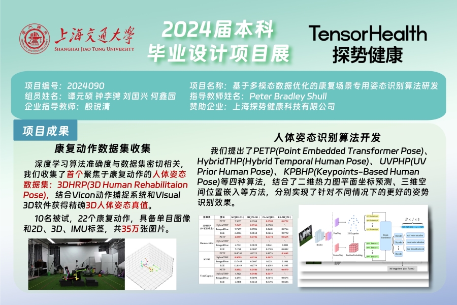 本项目提出了PETP(Point Embedded Transformer Pose)、 HybridTHP(Hybrid Temporal Human Pose)、 UVPHP(UV Prior Human Pose)、 KPBHP(Keypoints-Based Human Pose)四种算法,结合了二维热力图平面坐标预测、三维空间位置嵌入等方法,与领域内的现存方法相比,实现了更好的姿势识别效果。