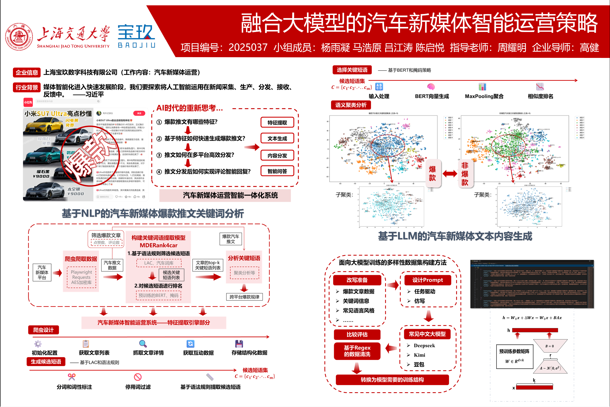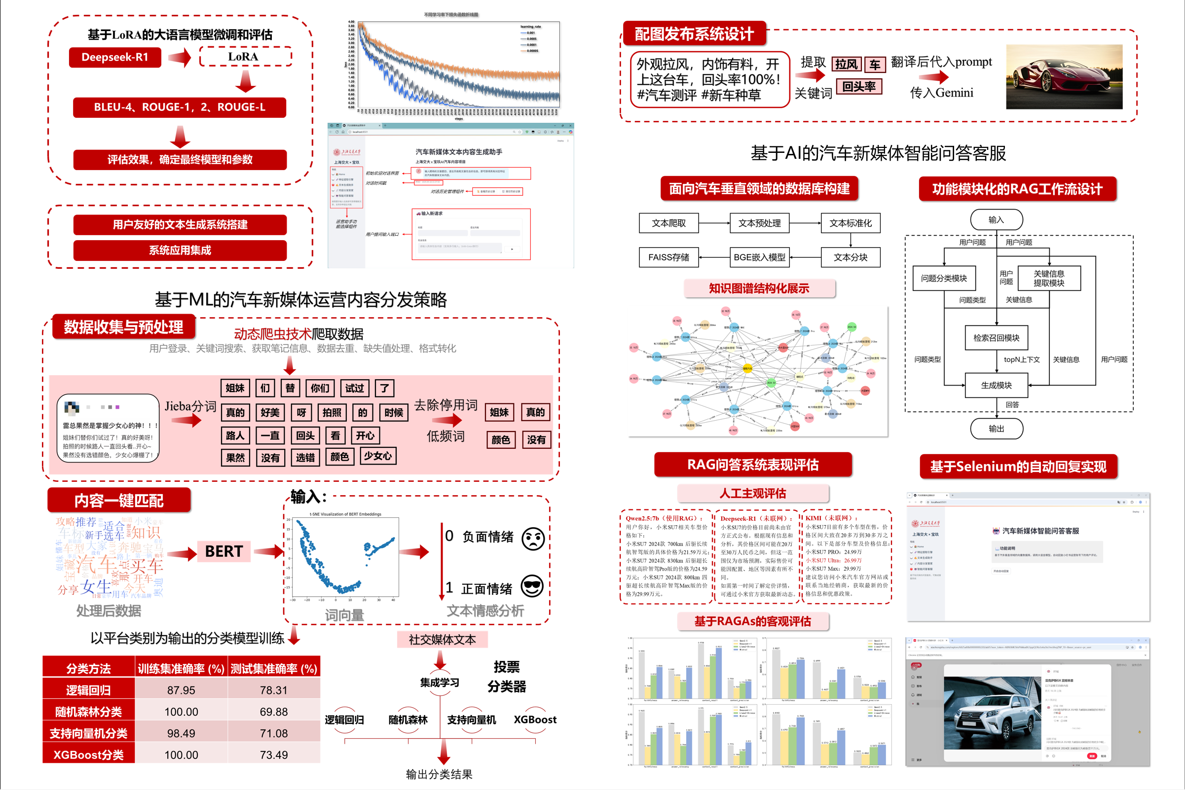 项目聚焦于AI技术,特别是大语言模型驱动下汽车新媒体内容运营的智能化升级,围绕热点识别、文本生成、图文协同发布与评论回应四大环节,构建智能一体化运营系统。核心目标包括:借助大模型识别汽车新媒体爆款推文特征,辅助内容决策;通过模型微调,结合用户输入,生成符合汽车行业垂类的原创爆款推文;结合ML分类算法智能匹配文本与分发平台,利用大模型自动生成配图,实现图文一键发布;融合RAG技术与汽车数据库,解析评论语义,自动生成自然、精准回复。通过全链路智能协同,全面提升内容传播效率与用户互动体验,助力品牌实现高效、高质的运营转型。