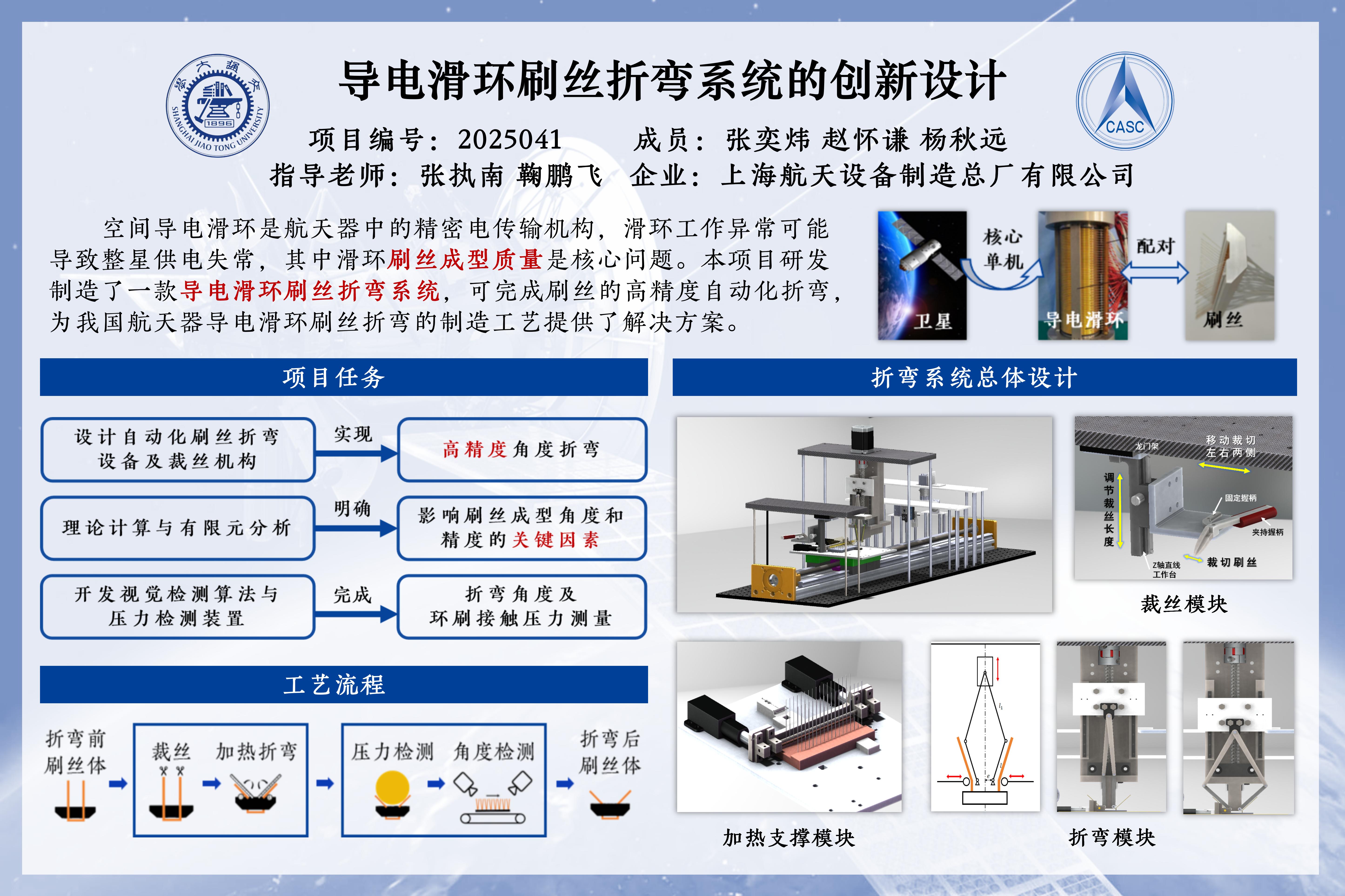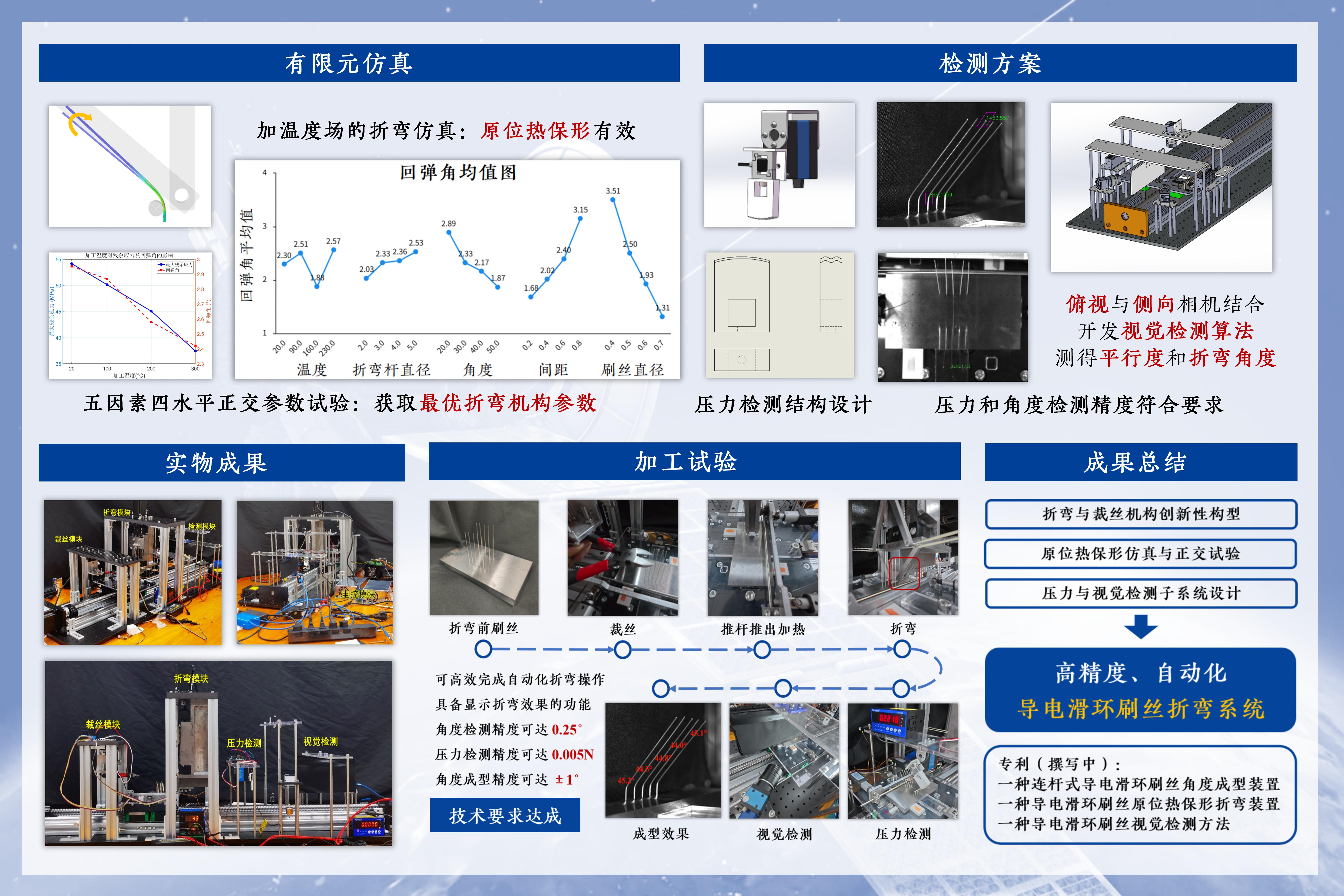 发展高可靠、长寿命、高精度与高稳定度航天器是世界各国航天事业发展的必然趋势。作为航天器中的核心单机,导电滑环的性能直接决定了系统的稳定性与可靠性,其中刷丝折弯过程中的角度控制对滑环的稳定性和使用寿命至关重要。当前导电滑环的制造中,存在刷丝折弯后回弹导致的工艺一致性差、人工折弯效率低的问题。为解决上述问题,本项目通过开展裁丝与折弯机构设计、折弯有限元仿真、压力与角度检测系统设计,创新设计了一款导电滑环刷丝折弯系统,提高了导电滑环的制造精度和生产效率。