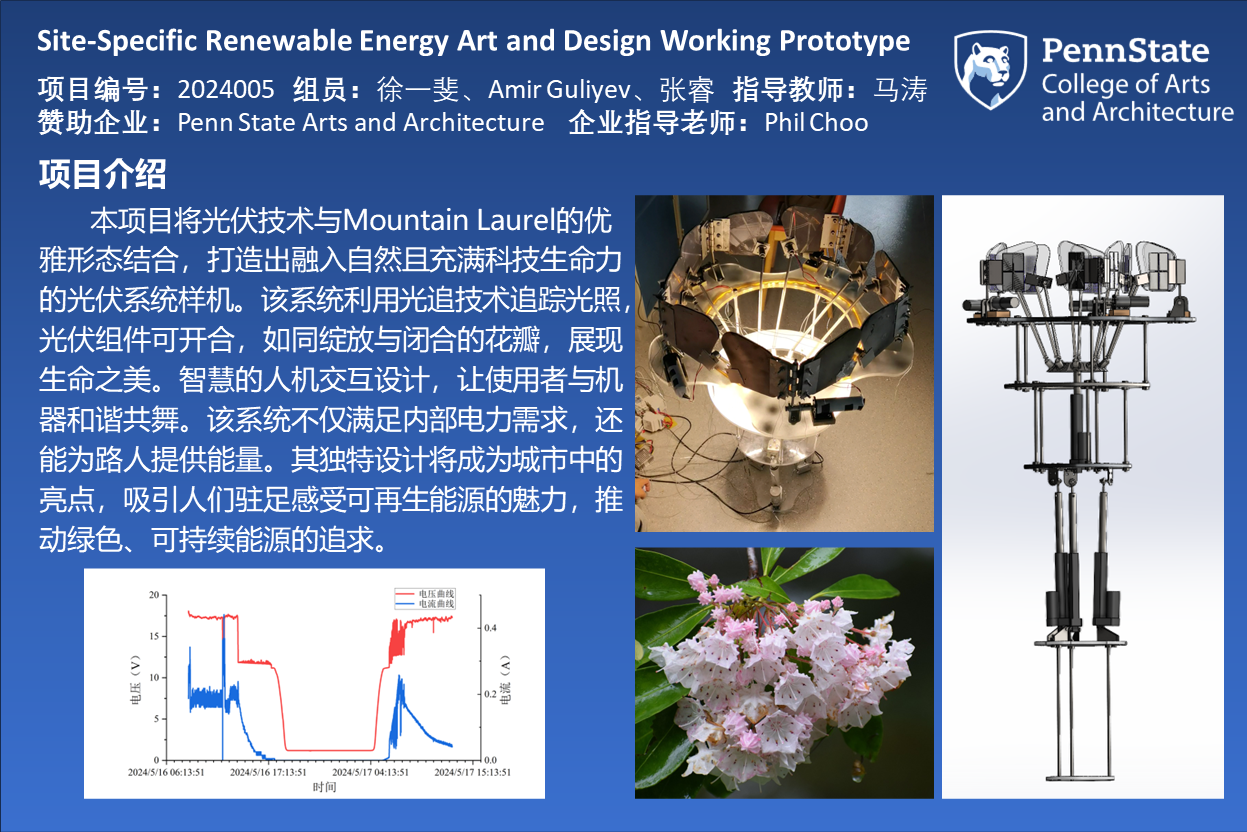 Site-Specific Renewable Energy Art and Design Working Prototype”项目在马涛老师的指导下,由Amir Guliyev、徐一斐、张睿三名员工共同完成。该项目旨在开发一款针对特定场地的可再生能源艺术与设计工作原型,融合艺术设计与可再生能源技术,探索创新的能源利用方式。通过与Penn State Arts and Architecture的Phil Choo教授的合作,项目将结合艺术美感和高效能源利用,减少能源消耗和环境污染,同时提升公众对可再生能源的关注和兴趣。项目成果将展现科技与艺术的融合,为未来的可持续发展提供新的视角和解决方案。