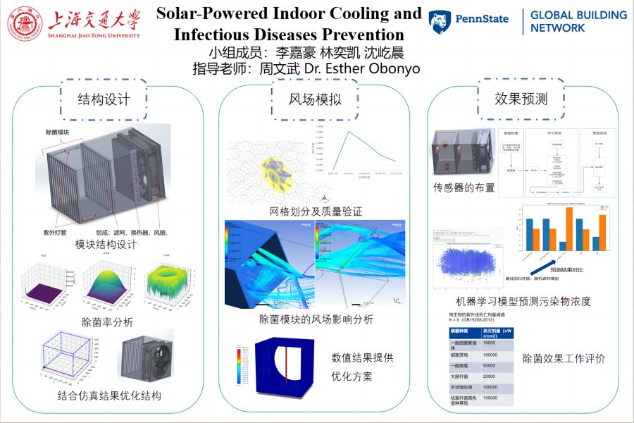 2023年夏季的高温威胁到世界上部分地区数百万人的生命。空调是人们在高温下维持基本生活质量必不可少的物件。同时,COVID-19疫情加强了传染病预防的重要性。在室内,病菌极易通过空气快速传播,所以空调系统尤其是中央空调会成为病菌传播的温床。在空调系统的基础上,添加除菌功能模块可以有效抑制空调系统内的病菌浓度,进而预防传染病在室内环境下的传播。本项目为伟德国际1946和美国宾州州立大学的合作毕设项目,旨在基于太阳能空调原型机设计除菌模块,预防传染病的传播。