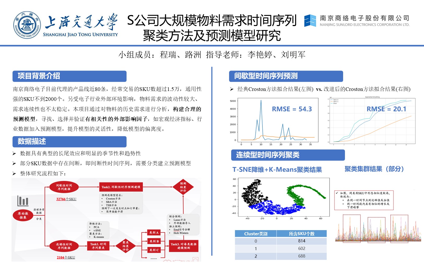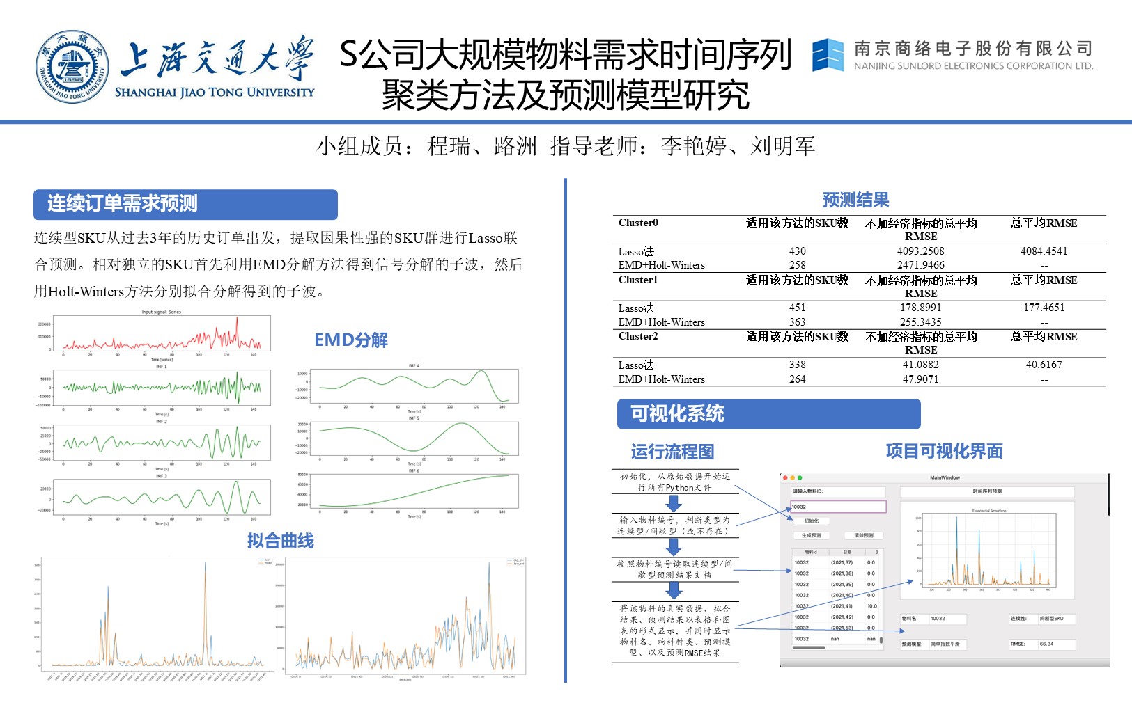 经过对SKU订单数据分析,将企业所有SKU分成了间歇性时间序列和连续型时间序列。其中,连续型时间序列2104个,间歇性时间序列16384个。间歇性时序数据采用了改进的Croston建模,直接对订单的间隔时间和订单量进行简单指数平滑预测未来时间点数据。针对连续时间序列,首先针对2104个sku的每条时间序列,提取了787个时间序列的统计特征,并采用t-SNE方法对高维度特征进行降维,将787维特征降至2维特征。再基于降维后的特征数据,通过K-means方法,对2014个SKU进行了聚类分析,将其分成了3类。其中,对每一类SKU分别做Grangers因果性检验,计算类中SKU两两之间的统计关联,提取因果性强的SKU进行Lasso预测。相对独立的SKU利用EMD分解方法提取出历史信号中的周期性和趋势,然后用Holt-Winters拟合子波,子波的预测相加得到预测模型。本文还加入了宏观经济数据和行业数据,通过在输入数据中增加“订货景气指数:计算机、通信和其他电子设备制造业”和“中信行业指数:被动元件”两个维度,提高了预测方法的适应性。