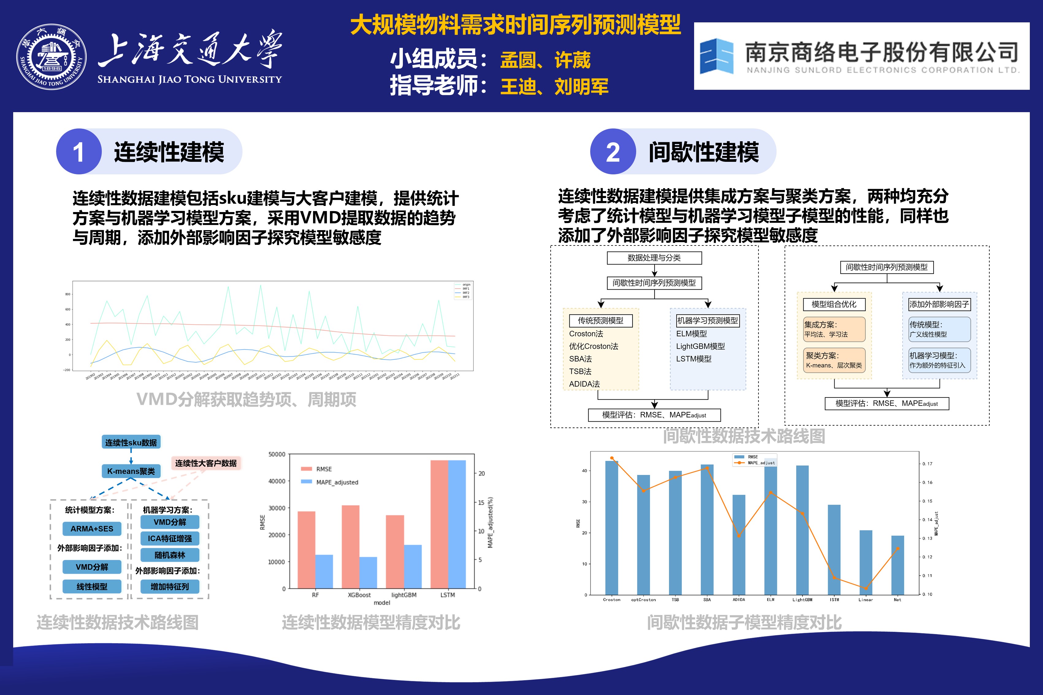 分析南京商洛电子的物料历史出货数据特性,将物料分为连续性和间歇性两大类,并分别构建物料需求预测模型,以提高物料需求预测的准确性。通过聚类方法进一步细分物料,或者通过集成方法进一步优化组合预测模型,提高预测方案的泛化性和鲁棒性。寻找、选择并验证有相关性的外部影响因子,例如行业数据,加入预测模型,提升预测模型的灵活性,降低预测模型的偏离度。此外,设计用户友好的物料需求预测可视化系统,在线输出物料需求预测结果,方便企业人员查看并据此作出科学合理的采购决策。