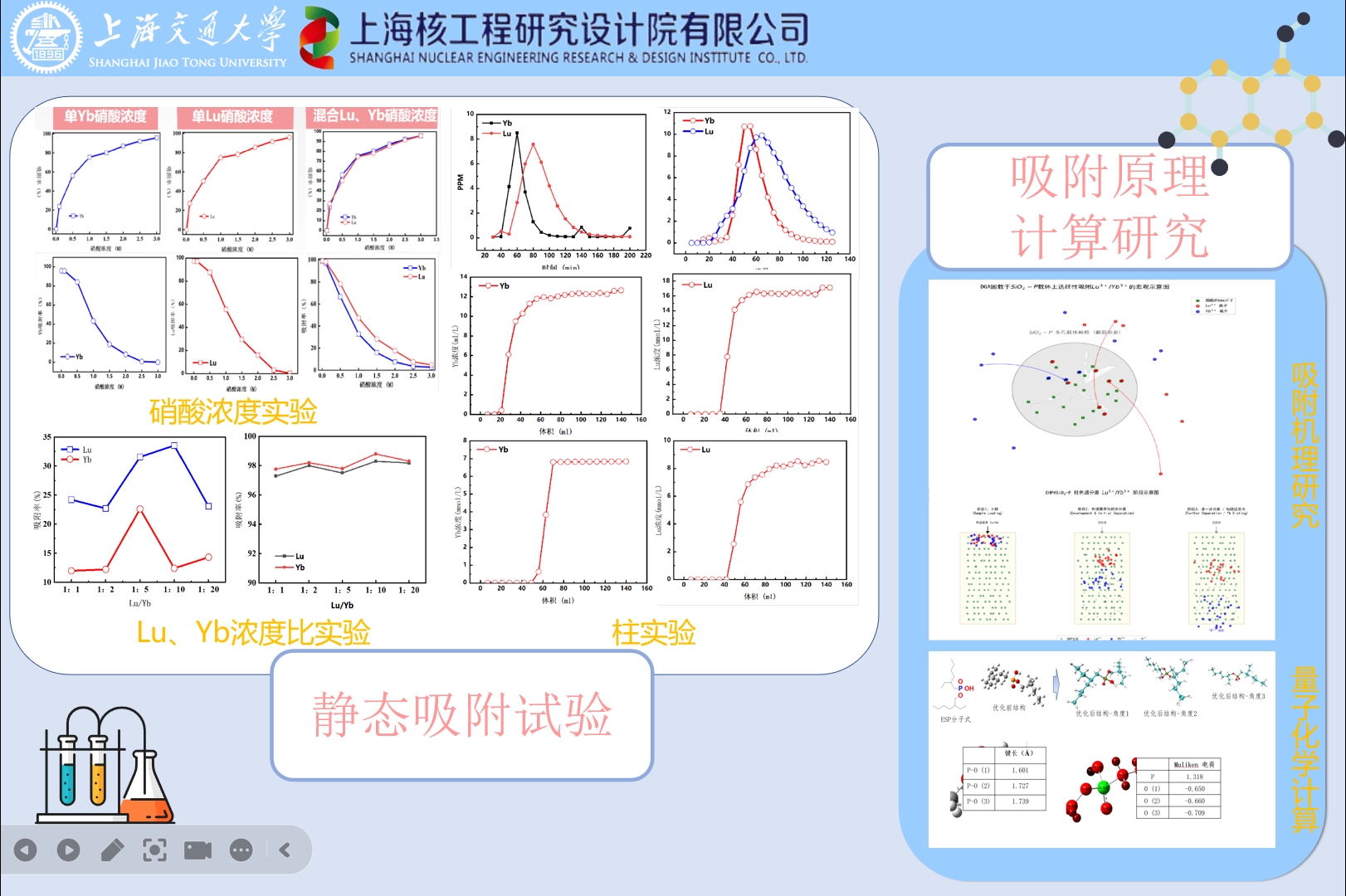 基于177Lu生产的“间接法”工艺,开发一种将无载体177Lu产物从反应后靶件溶解液分离出来的工艺。项目以合成两种硅基复合材料吸附剂,即含酰胺类基团吸附材料DGA与含磷酸类基团吸附材料EHP为基础,通过吸附材料合成、静态试验、吸附材料表征、DFT计算等实验与计算手段探究合适的分离途径,并以此类实验数据为基础进行动态吸附柱实验,灌装离子分离色谱柱,实现分离工艺的开发。