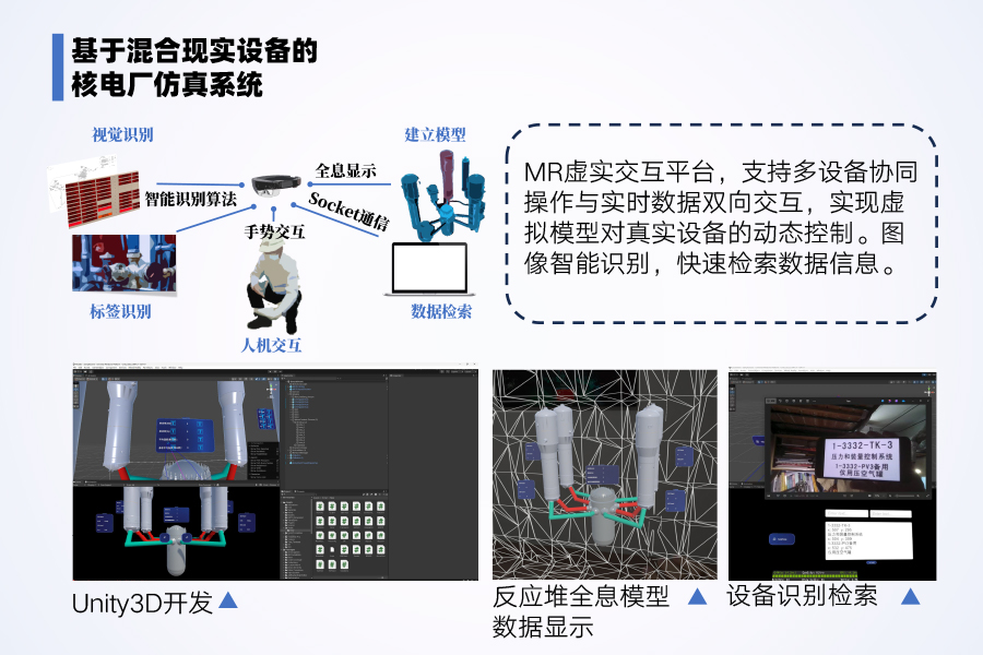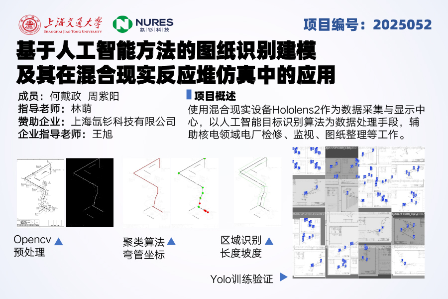 本项目以核能行业数字化转型为背景,聚焦核电站图纸识别效率低、建模流程复杂等痛点,提出“基于人工智能方法的图纸识别建模及其在混合现实(MR)反应堆仿真中的应用”。项目由伟德国际1946与上海氙钐科技有限公司合作开展,旨在通过深度学习技术(如YOLO算法)实现核电站图纸的自动化识别与建模,并结合MR技术构建虚实交互的仿真平台。具体内容包含两部分:一是开发图纸智能解析系统,自动提取管道布局、设备参数等关键信息并生成三维模型;二是基于HoloLens2设备实现多机协同、实时数据交互的MR仿真应用,支持核电站设计、检修等场景的虚拟操作。项目通过技术创新推动核能行业智能化升级,助力“双碳”目标实现,兼具工业应用价值和市场潜力。