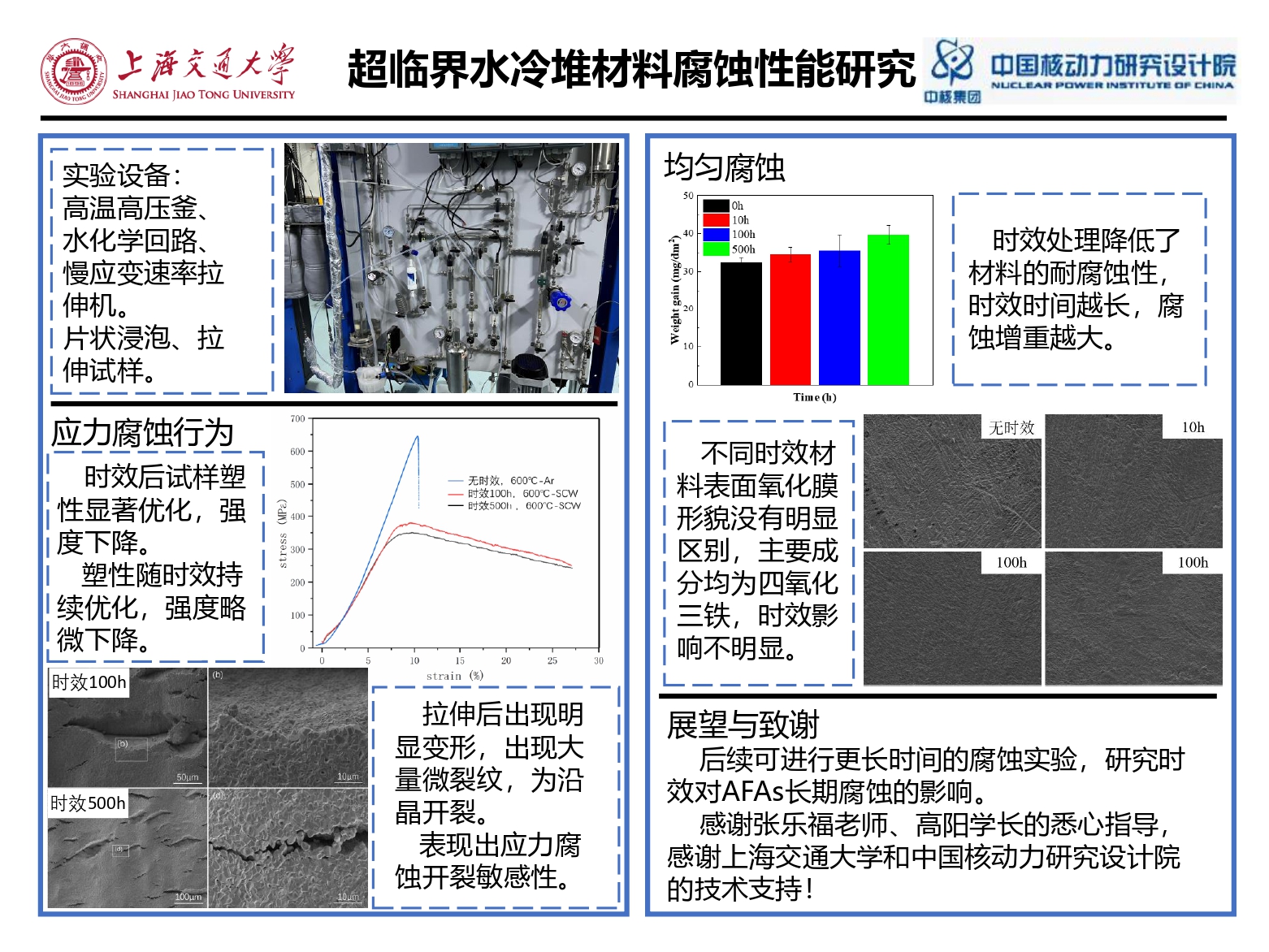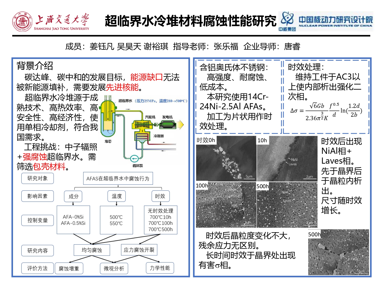 本项目旨在研究新型材料以及热处理工艺对于超临界水冷堆包壳生产的潜力,为包壳研发、材料腐蚀数据库提供数据支持,主要研究对象为成分、温度、时效处理对于14Cr-24Ni-2.5Al含铝奥氏体不锈钢(AFAs)在超临界水环境均匀腐蚀、应力腐蚀开裂行为的影响,控制变量,使用浸泡腐蚀实验研究均匀腐蚀行为、使用慢应变拉伸速率实验研究应力腐蚀开裂行为,通过拟合腐蚀增重曲线、分析应力-应变曲线、分析微观形貌判断试样的性能。